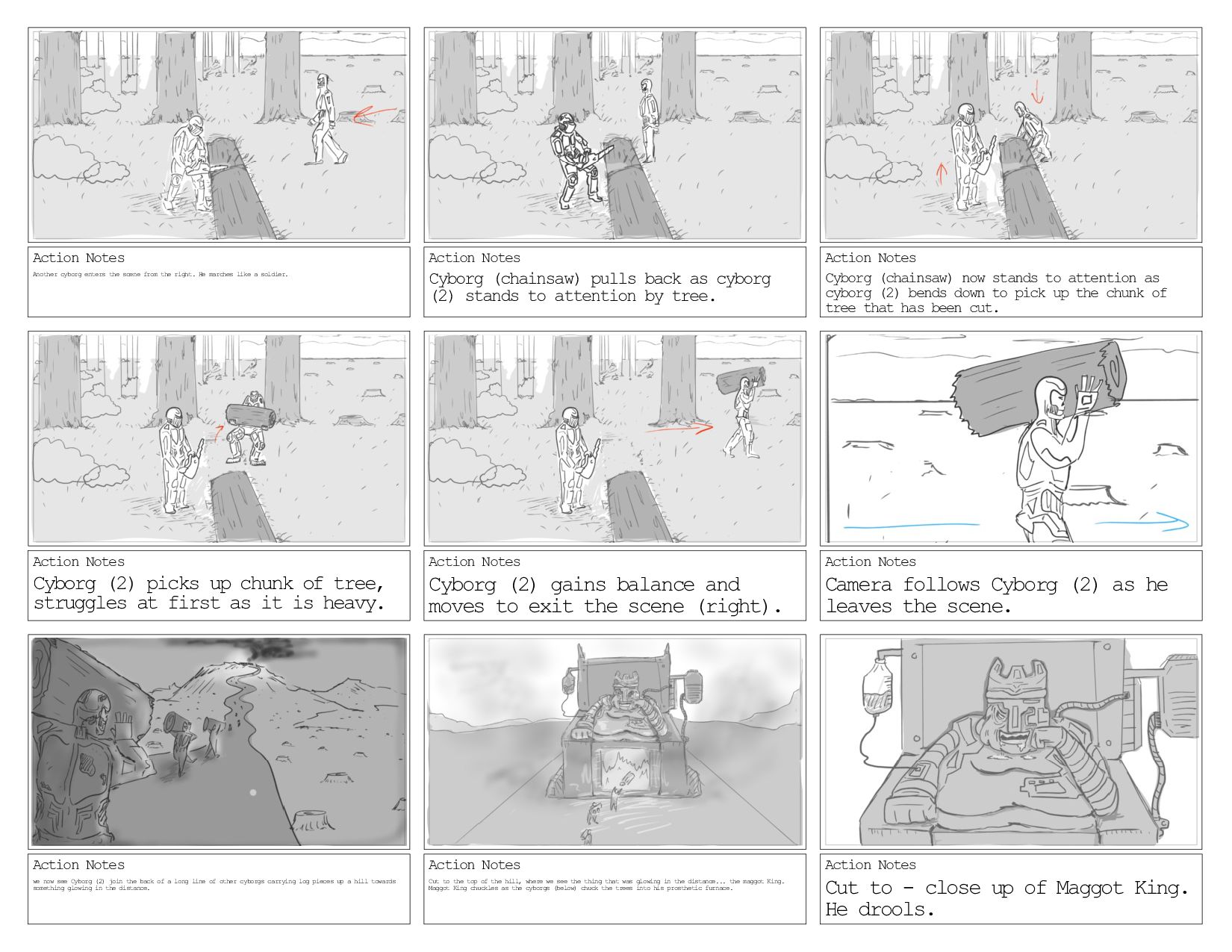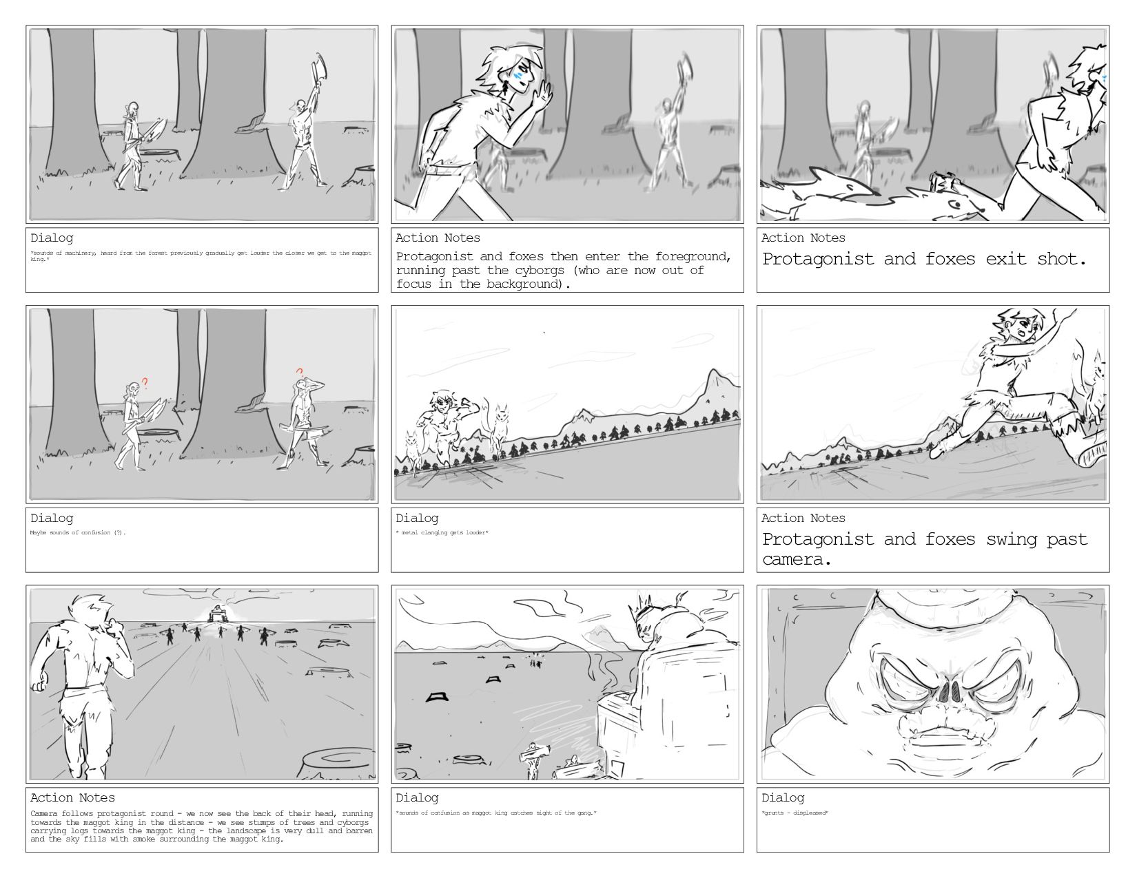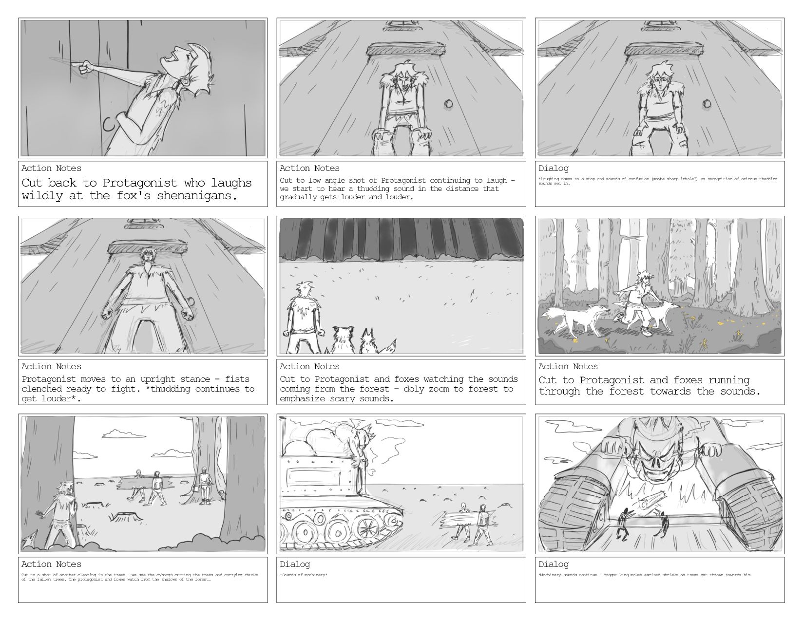 the fox's shenanigans. Action Notes Cut to low angle shot of Protagonist continuing to laugh - we start to hear a thudding sound in the distance that gradually gets louder and louder. Dialog *laughing comes to a stop and sounds of confusion (maybe sharp inhale?) as recognition of ominous thudding sounds set in. Action Notes Protagonist moves to an upright stance - fists clenched ready to fight. *thudding continues to get louder*. Action Notes Cut to Protagonist and foxes watching the sounds coming from the forest - doly zoom to forest to emphasize scary sounds. Action Notes Cut to Protagonist and foxes running through the forest towards the sounds. Action Notes Cut to a shot of another clearing in the trees - we see the cyborgs cutting the trees and carrying chunks of the fallen trees. The protagonist and foxes watch from the shadows of the forest. Dialog *Sounds of machinery* Dialog *Machinery sounds continue - Maggot king makes excited shrieks as trees get thrown towards him.