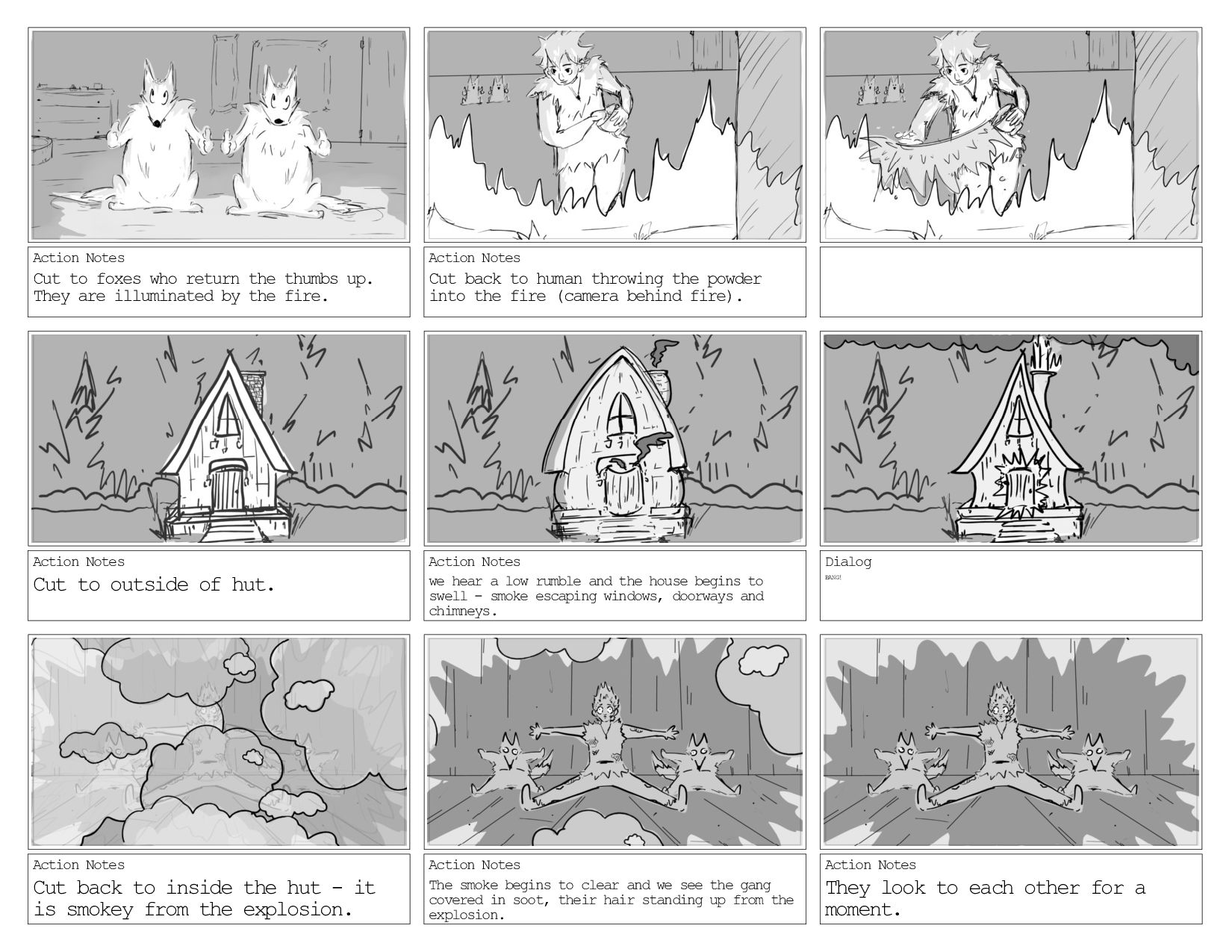 They are illuminated by the fire. Action Notes Cut back to human throwing the powder into the fire (camera behind fire). Action Notes Cut to outside of hut. Action Notes we hear a low rumble and the house begins to swell - smoke escaping windows, doorways and chimneys. Dialog BANG! Action Notes Cut back to inside the hut - it is smokey from the explosion. Action Notes The smoke begins to clear and we see the gang covered in soot, their hair standing up from the explosion. Action Notes They look to each other for a moment.