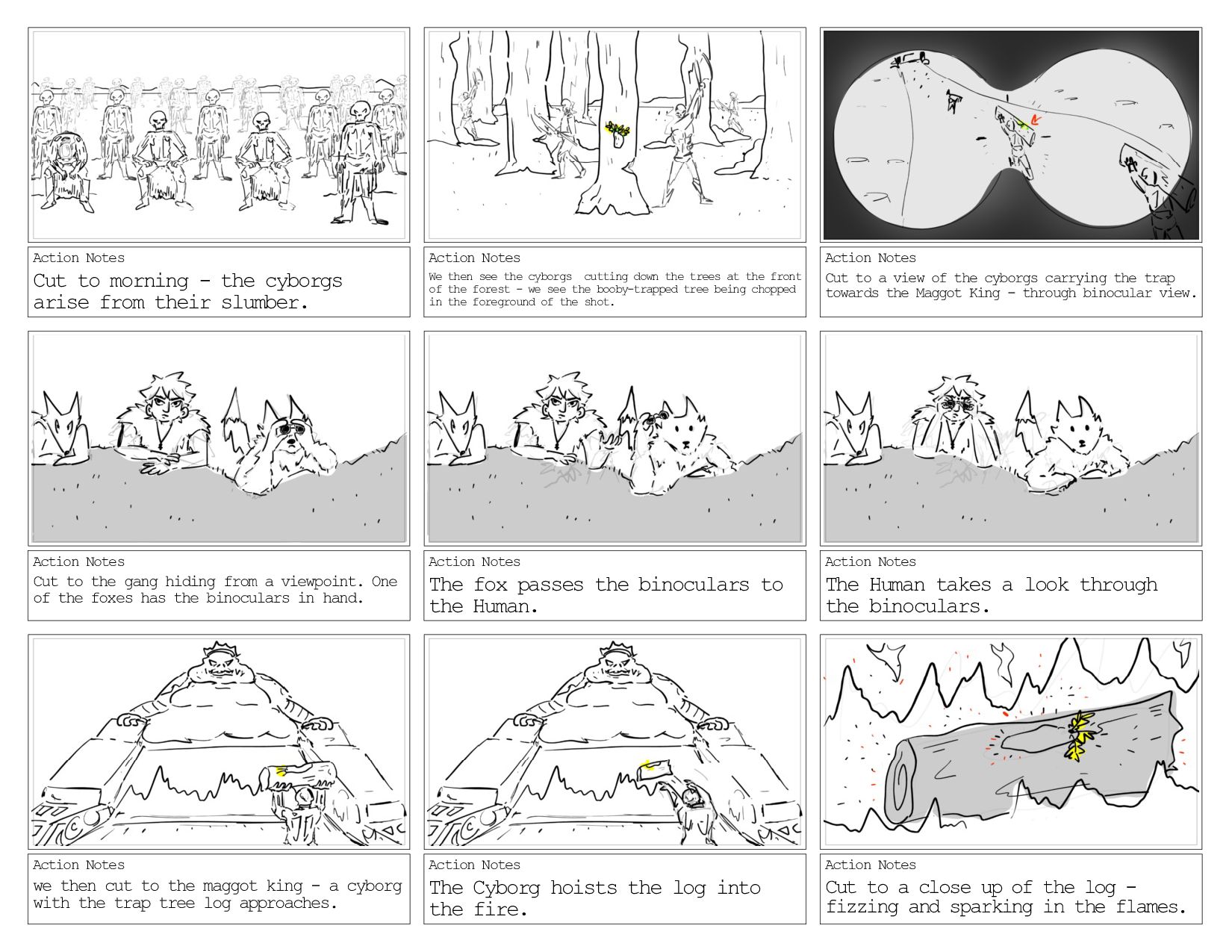 their slumber. Action Notes We then see the cyborgs cutting down the trees at the front of the forest - we see the booby-trapped tree being chopped in the foreground of the shot. Action Notes Cut to a view of the cyborgs carrying the trap towards the Maggot King - through binocular view. Action Notes Cut to the gang hiding from a viewpoint. One of the foxes has the binoculars in hand. Action Notes The fox passes the binoculars to the Human. Action Notes The Human takes a look through the binoculars. Action Notes we then cut to the maggot king - a cyborg with the trap tree log approaches. Action Notes The Cyborg hoists the log into the fire. Action Notes Cut to a close up of the log - fizzing and sparking in the flames.