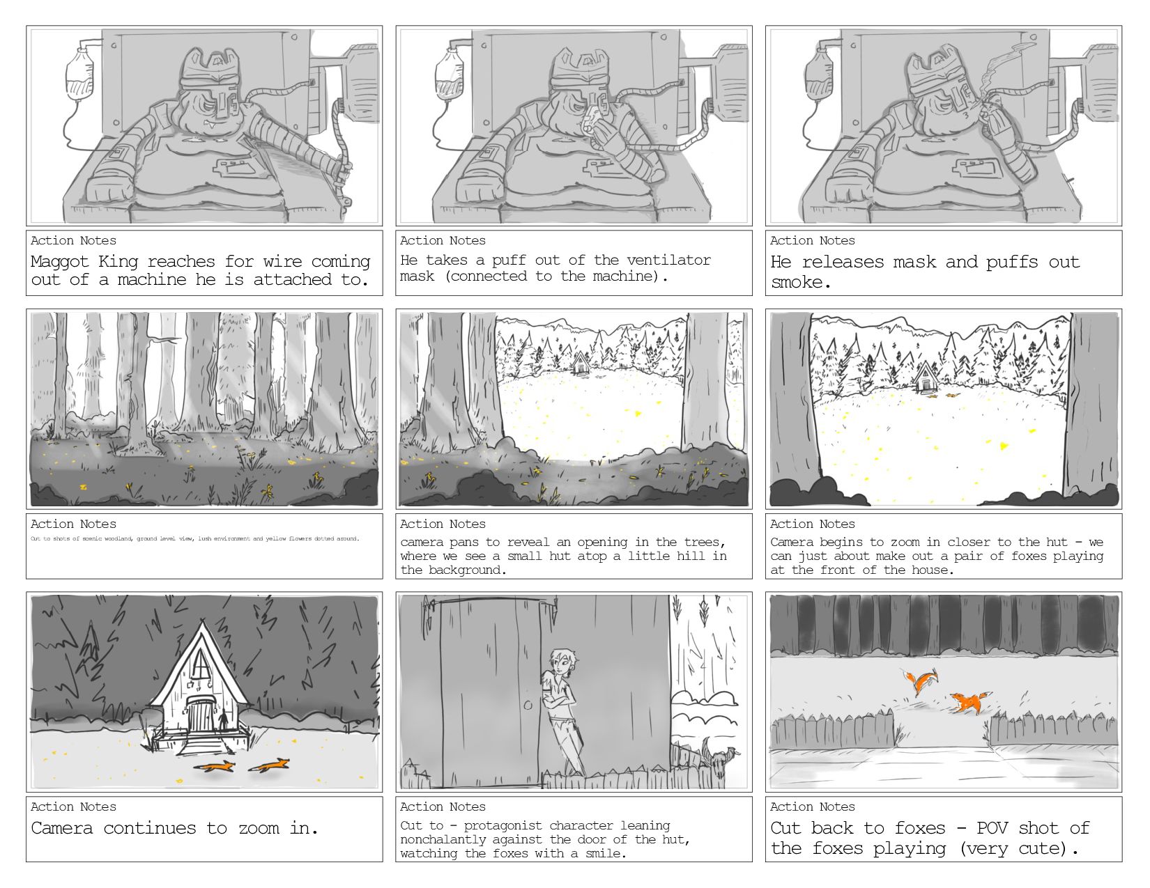 a machine he is attached to. Action Notes He takes a puff out of the ventilator mask (connected to the machine). Action Notes He releases mask and puffs out smoke. Action Notes Cut to shots of scenic woodland, ground level view, lush environment and yellow flowers dotted around. Action Notes camera pans to reveal an opening in the trees, where we see a small hut atop a little hill in the background. Action Notes Camera begins to zoom in closer to the hut - we can just about make out a pair of foxes playing at the front of the house. Action Notes Camera continues to zoom in. Action Notes Cut to - protagonist character leaning nonchalantly against the door of the hut, watching the foxes with a smile. Action Notes Cut back to foxes - POV shot of the foxes playing (very cute).