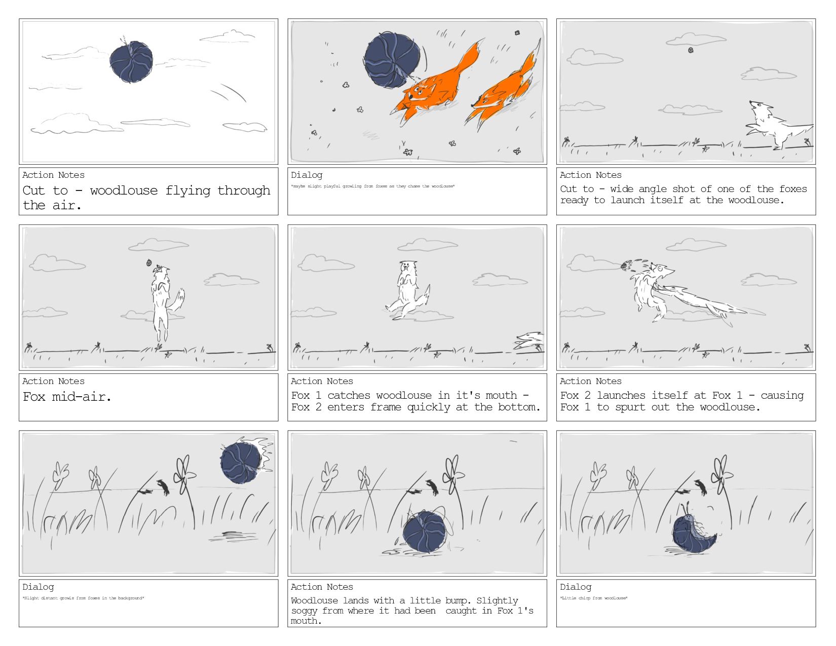 Dialog *maybe slight playful growling from foxes as they chase the woodlouse* Action Notes Cut to - wide angle shot of one of the foxes ready to launch itself at the woodlouse. Action Notes Fox mid-air. Action Notes Fox 1 catches woodlouse in it's mouth - Fox 2 enters frame quickly at the bottom. Action Notes Fox 2 launches itself at Fox 1 - causing Fox 1 to spurt out the woodlouse. Dialog *Slight distant growls from foxes in the background* Action Notes Woodlouse lands with a little bump. Slightly soggy from where it had been caught in Fox 1's mouth. Dialog *Little chirp from woodlouse*