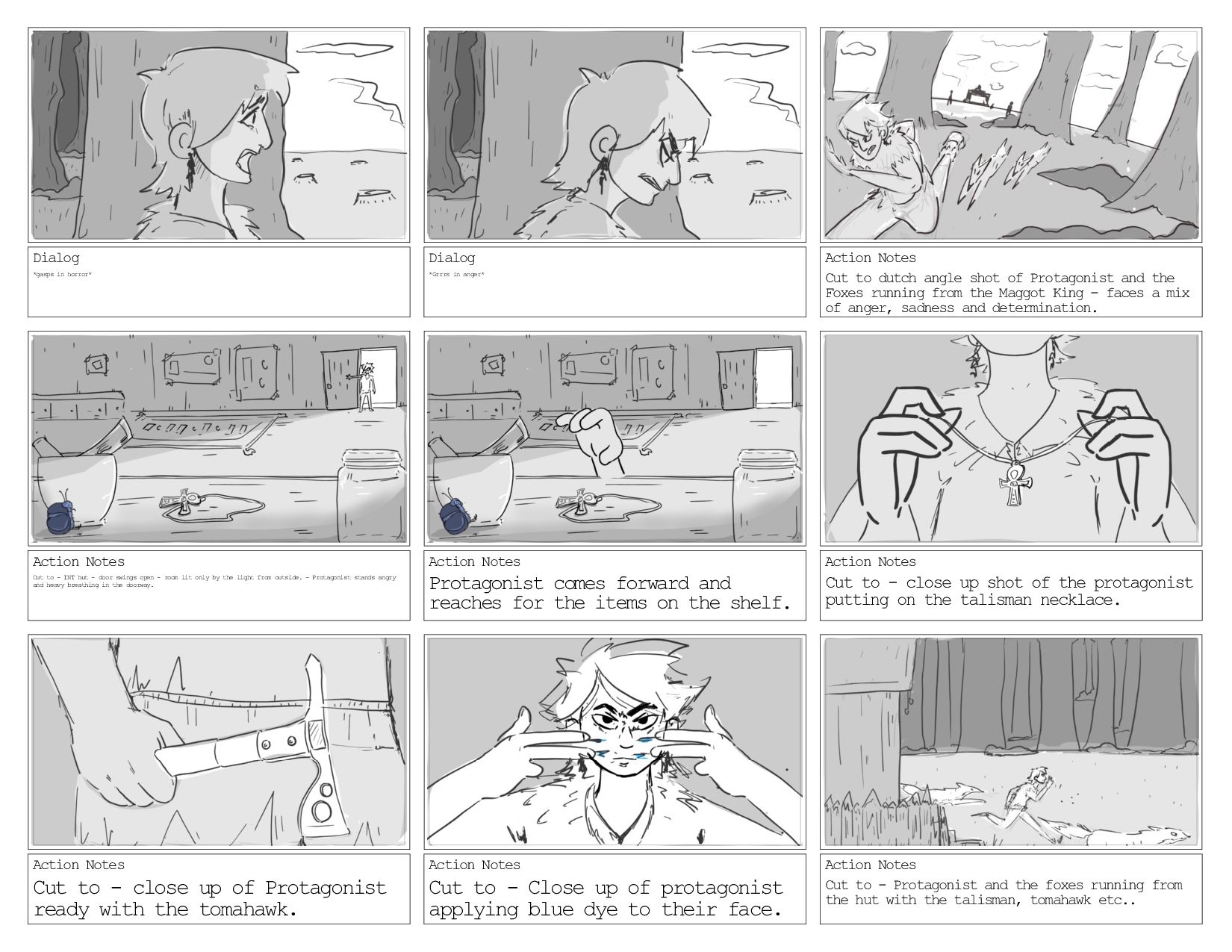 Cut to dutch angle shot of Protagonist and the Foxes running from the Maggot King - faces a mix of anger, sadness and determination. Action Notes Cut to - INT hut - door swings open - room lit only by the light from outside. - Protagonist stands angry and heavy breathing in the doorway. Action Notes Protagonist comes forward and reaches for the items on the shelf. Action Notes Cut to - close up shot of the protagonist putting on the talisman necklace. Action Notes Cut to - close up of Protagonist ready with the tomahawk. Action Notes Cut to - Close up of protagonist applying blue dye to their face. Action Notes Cut to - Protagonist and the foxes running from the hut with the talisman, tomahawk etc..