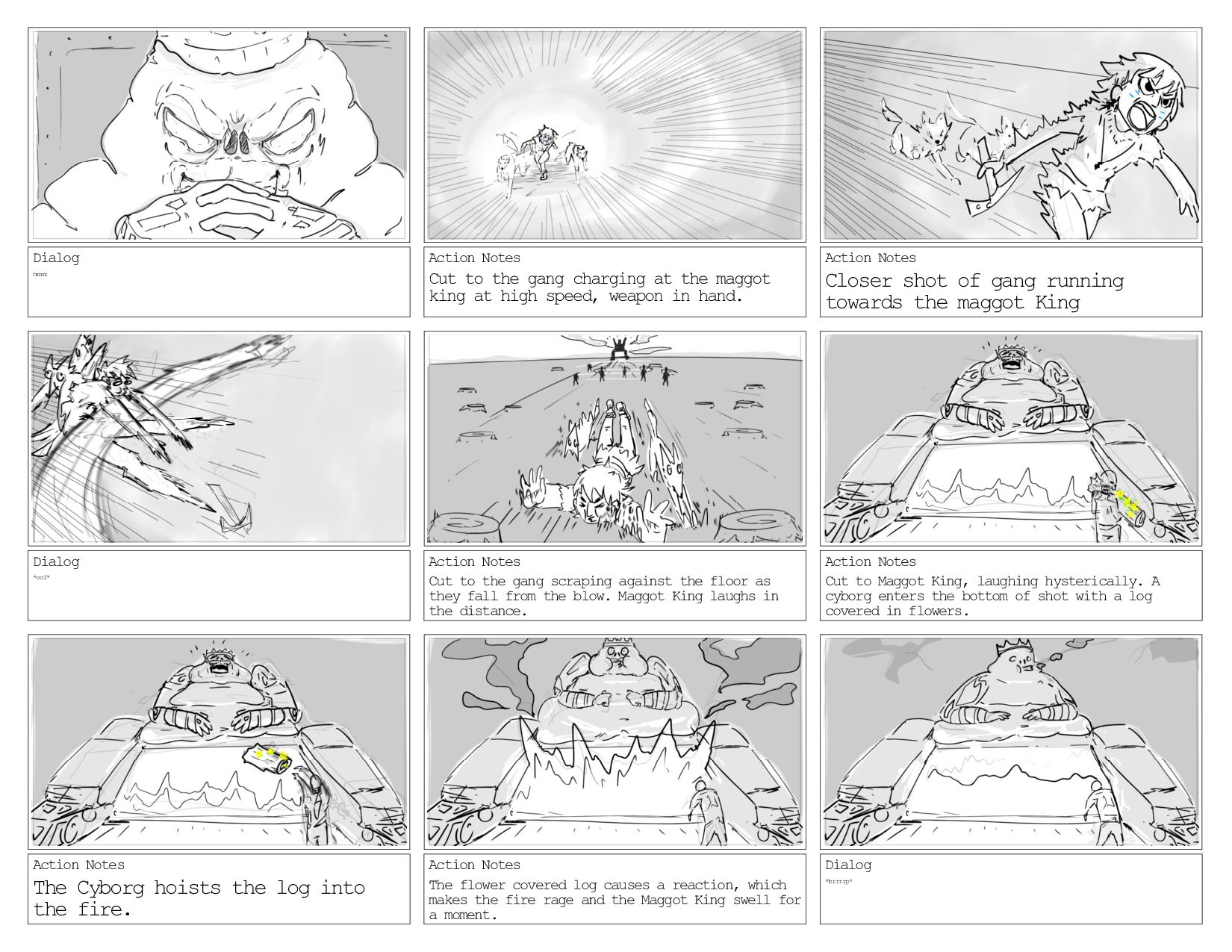the maggot king at high speed, weapon in hand. Action Notes Closer shot of gang running towards the maggot King Dialog *oof* Action Notes Cut to the gang scraping against the floor as they fall from the blow. Maggot King laughs in the distance. Action Notes Cut to Maggot King, laughing hysterically. A cyborg enters the bottom of shot with a log covered in flowers. Action Notes The Cyborg hoists the log into the fire. Action Notes The flower covered log causes a reaction, which makes the fire rage and the Maggot King swell for a moment. Dialog *brrrrp*
