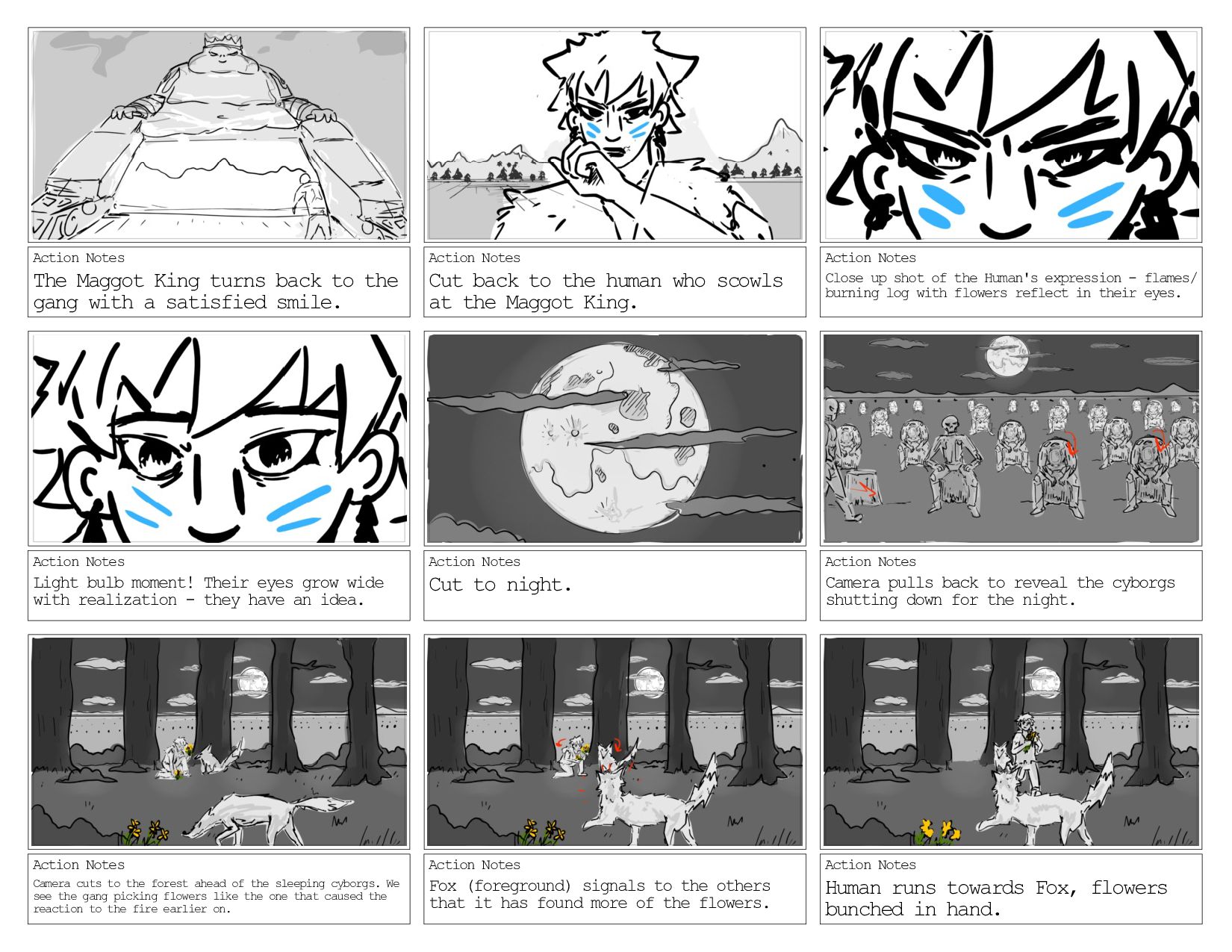 with a satisfied smile. Action Notes Cut back to the human who scowls at the Maggot King. Action Notes Close up shot of the Human's expression - flames/ burning log with flowers reflect in their eyes. Action Notes Light bulb moment! Their eyes grow wide with realization - they have an idea. Action Notes Cut to night. Action Notes Camera pulls back to reveal the cyborgs shutting down for the night. Action Notes Camera cuts to the forest ahead of the sleeping cyborgs. We see the gang picking flowers like the one that caused the reaction to the fire earlier on. Action Notes Fox (foreground) signals to the others that it has found more of the flowers. Action Notes Human runs towards Fox, flowers bunched in hand.