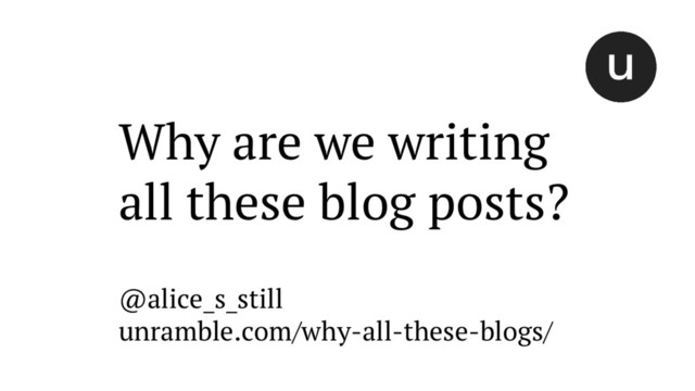 In this talk, Alice will look at the reasons for writing things online and argue that it isn’t realistic, or necessary, to constantly churn out loads of content.