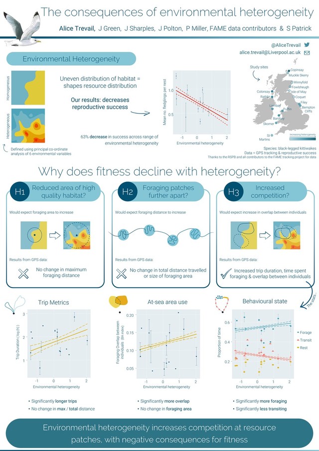Poster, awarded with 1st prize, from the annual meeting of the ACCE Doctoral Training Partnership, on my research of the effects of environmental heterogeneity on foraging behaviour and reproductive success