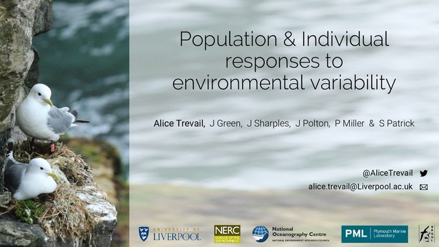 Presentation on the role of environmental heterogeneity in shaping foraging behaviour and driving reproductive success at the British Ornithological Union, March 2017. Here we show that environmental heterogeneity increases trip duration, and decreases breeding success, using data from 15 colonies around the UK. This talk was awarded 2nd prize.