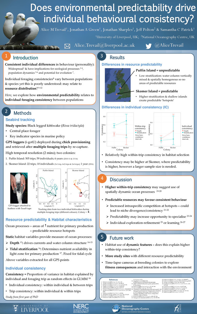 Low stratification: water column vertically mixed & spatially homogenous so no areas of predictable resources Skomer Island = predictable • Higher stratification & shallow islands create predictable ‘hotspots’ Differences in individual consistency (IC) • Relatively high within-trip consistency in habitat selection • Consistency may be higher at Skomer, where predictability is higher, however a larger sample size is needed. 3 Does environmental predictability drive individual behavioural consistency? Alice M Trevail1, Jonathan A Green1, Jonathan Sharples1, Jeff Polton2 & Samantha C Patrick1 1University of Liverpool, UK; 2National Oceanography Centre, UK [email protected] @AliceTrevail Methods Seabird tracking Study species: Black legged kittiwake (Rissa tridactyla) • Central place forager • Key indicator species in marine policy GPS loggers (i-gotU) deployed during chick provisioning and retrieved after multiple foraging trips by re-capture. High temporal resolution (2 mins); two colonies: 1. Puffin Island: 505 trips; 59 individuals; 6 years (2010-11 & 13-16) 2. Skomer Island: 22 trips; 10 individuals (3x1 trip, 4x2 trips & 2x4 trips); 1 year (2016) Resource predictability & Habitat characteristics Ocean processes » areas of nutrient for primary production » predictable resource hotspots Static habitat variables provide measure of ocean processes: Depth 13: drives currents and water column structure 14-15 Tidal stratification 16: Determines nutrient availability in light zone for primary production 17. Fixed for tidal cycle Above variables extracted for all GPS points Individual consistency Consistency = Proportion of variance in habitat explained by individual and foraging trip as random effects in GLMM 18 • Individual consistency: within individual & between trips • Trip consistency: within individual & within trips Study from first year of PhD 2 Future work • Habitat use of dynamic features » does this explain higher within-trip consistency? • More study sites with different resource predictability • Time-lapse cameras at breeding colonies to explore fitness consequences and interaction with the environment References 1. Bolnick et al (2003) Amer Nat. 16: 1-28 2. Araújo et al (2011) Ecol Letters. 14: 948-58 3. Bolnick et al (2011) Trends Eco. Evol. 24: 183-192 4. Hughes et al (2008) Ecol Letters 11:609-623 5. Anderson et al (2009) Polar Biol. 32:27-33 6. Patrick & Weimerskirch (2014) Biol Letters. 10:20140630 7. Agashe et al (2010) Proc R Soc Lond B Biol Sci. 277: 2915- 2924 8. Patrick et al (2014) PLoS ONE. 9: e87269 9. Humphries & Sims (2014) J Theor Biol. 358: 179-193 10. Krasnov et al (2006) Parasitology 133:81-88 11. Svensson-Coelho et al (2016) Mol Ecol DOI: 10.1111/mec.13758 12. Angerbjorn et al (2004) DOI: 10.1093/acprof:oso/9780198515562.003.0008 13. GEBCO (Global bathymetric grid); updated 2014; 30”Resolution 14. Piatt et al (2006) Deep Sea Res II. 53: 387-398 15. Yen et al (2004) J Mar Syst. 50: 79-99 16. Calculated as log10(bathymetry/(M2 tidal speed)3). M2 tidal speed generated from 3D hydrostatic simulation of NW European shelf using NEMO (Nucleus for European Modelling of the Ocean; configuration AMM60); 1.8km resolution 17. Scott et al (2010) Mar Ecol Prog Ser. 408: 207-226 18. Nakagawa & Schielzeth (2010) Biol Rev. 85: 935-956 19. Scales et al (2014) J R Soc. Interface. 11: 20140679 20. Scales et al (2016) Ecography. DOI: 10.1111/ecog.02272 21. Araujo et al (2008) Ecology. 89: 1981-1983 22. Svanback et al (2007) Proc R Soc Lond B Biol Sci. 274: 839-844 23. Layman et al (2007) Ecol Letters. 10: 937-944 24. Darimont et al (2009) J Anim Ecol. 78: 126-133 25. Guilford et al (2011) PLoS ONE. 6: e21336 26. Sargeant & Mann (2009) Anim Behav. 78: 715-721 27. Hunt et al (2007) Biol Letters. 3: 173-175 Discussion • Higher within-trip consistency may suggest use of spatially dynamic ocean processes 19-20 • Predictable resources may favour consistent behaviour Increased intraspecific competition at hotspots » could lead to niche divergence/consistency 21-22 Predictability may increase opportunity to specialise 23-24 Individual exploration-refinement 25 or learning 26-27 4 5 Tracking data from two individual kittiwakes during multiple foraging trips (different colours). Colony = . GPS logger attached to feathers with Tesa® tape -5.5 -5.4 -5.3 -5.2 51.7 51.8 51.9 52 Longitude (°) Latitude (°) Skomer Island -4.4 -4.3 -4.2 -4.1 -4 53.3 53.4 53.5 53.6 Longitude (°) Latitude (°) Puffin Island Introduction Consistent individual differences in behaviour (personality): Widespread1 & have implications for ecological processes 2-4, population dynamics 5-6 and potential for evolution 7. Individual foraging consistencies8 vary between populations & species yet this is poorly understood: may relate to resource distribution? 9-12 Here, we explore how environmental predictability relates to individual foraging consistency between populations 1 0.0 0.2 0.4 Puffin Skomer Colony Consistency Individual consistency Depth Stratification 0.2 0.4 0.6 0.8 Puffin Skomer Colony Consistency Within-trip consistency Depth Stratification Error bars: confidence intervals Error bars: confidence intervals