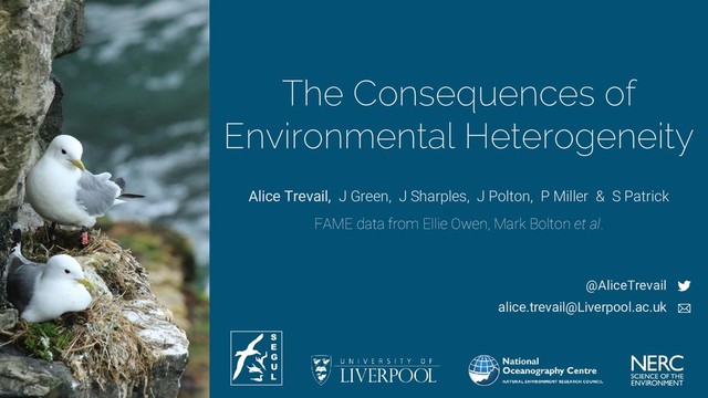 Presentation on work from my PhD about the effect of environmental heterogeneity on seabird behaviour and fitness. Thank you to the scientific committe for awarding me with joint first student presentation for this talk.