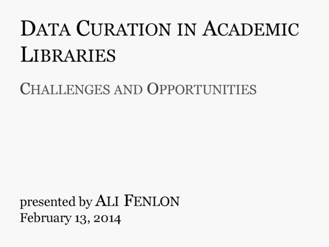 & Smith, L. C. (2007). An Educational Program on Data Curation. Presented at the American Library Association Conference, Washington, D.C. http://hdl.handle.net/2142/3493 Lord, P., Macdonald, A., Lyon, L., & Giaretta, D. (2004). From Data Deluge to Data Curation. Proc 3th UK e-Science All Hands Meeting. Scaramozzino, J. M., Ramírez, M. L., & McGaughey, K. J. (2012). A Study of Faculty Data Curation Behaviors and Attitudes at a Teaching-Centered University. College & Research Libraries, 73(4). http://crl.acrl.org/content/73/4/349 Senseney, M., Muñoz, T., Flanders, J., & Fenlon, A. (In Press). Digital Humanities Data Curation Institutes: Challenges and Preliminary Findings. Digital Humanities 2014, Lausanne, Switzerland. UK Data Archive. Research Data Lifecycle. http://www.data-archive.ac.uk/create-manage/life-cycle