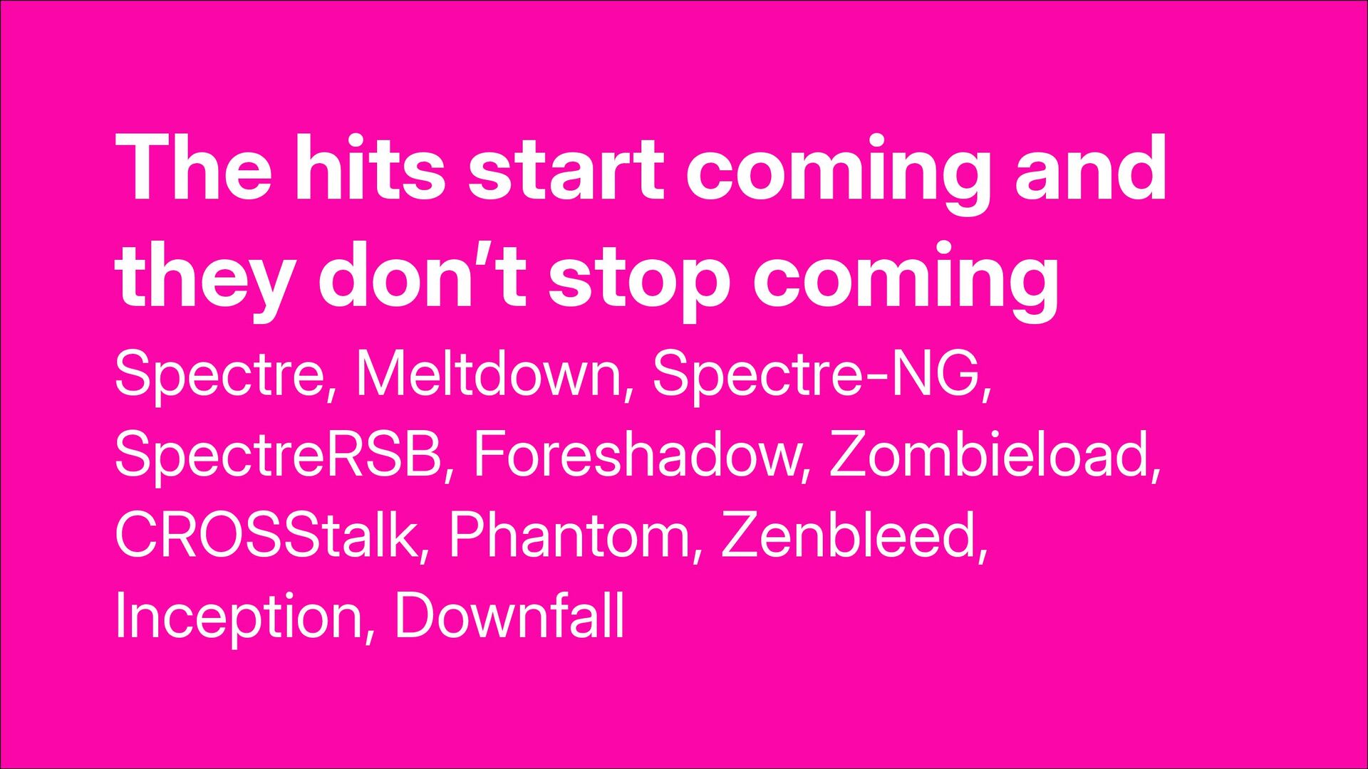 Meltdown, Spectre-NG, SpectreRSB, Foreshadow, Zombieload, CROSStalk, Phantom, Zenbleed, Inception, Downfall