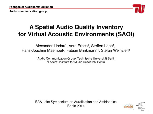 Lindau, A.; Erbes, V.; Maempel, H.-J.; Lepa, S., Brinkmann, F.; Weinzierl, S.: "A Spatial Audio Quality Inventory for Virtual Acoustic Environments (SAQI)", Talk given at EAA Joint Symposium on Auralization and Ambisonics, Berlin, 2014