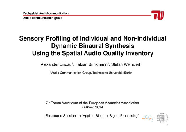 Alexander Lindau, Fabian Brinkmann, Stefan Weinzierl (2014): "Sensory Profiling of Individual and Non-individual Dynamic Binaural Synthesis Using the Spatial Audio Quality Inventory" , talk given at the Forum Acusticum, Krakow, Poland, 2014