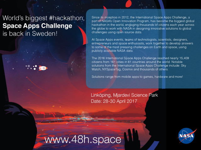 a part of NASA’s Open Innovation Program, has become the biggest global hackathon in the world, engaging thousands of citizens each year across the globe to work with NASA in designing innovative solutions to global challenges using open source data. At Space Apps events, teams of technologists, scientists, designers, entrepreneurs and space enthusiasts, work together to develop answers to some of the most pressing challenges on Earth and space, using publicly available NASA data. The 2016 International Space Apps Challenge reached nearly 15,409 citizens from 161 cities in 61 countries around the world. Notable solutions from the International Space Apps Challenge include: Sky Watch, NYSpaceTag, Cosmix and thousands of others. Solutions range from mobile apps to games, hardware and more! Date: 28-30 April 2017 Linköping, Mjardevi Science Park www.48h.space World’s biggest #hackathon, Space Apps Challenge is back in Sweden!