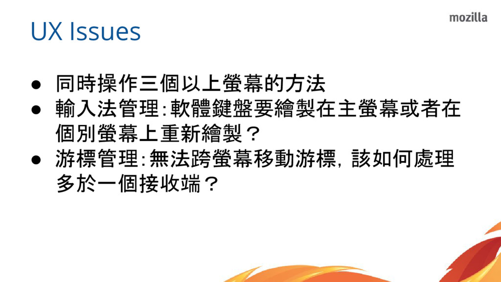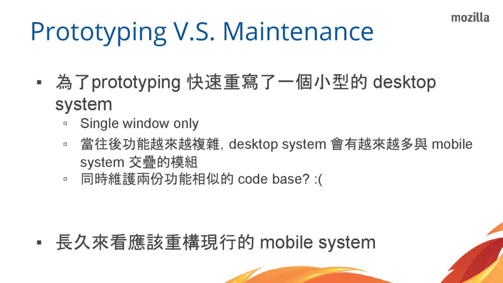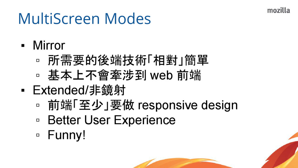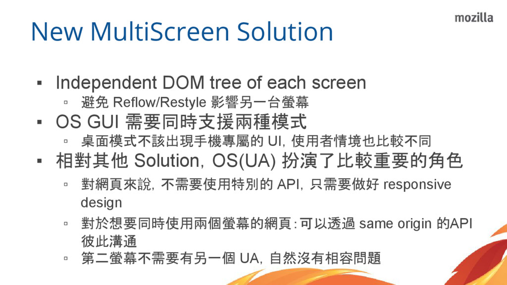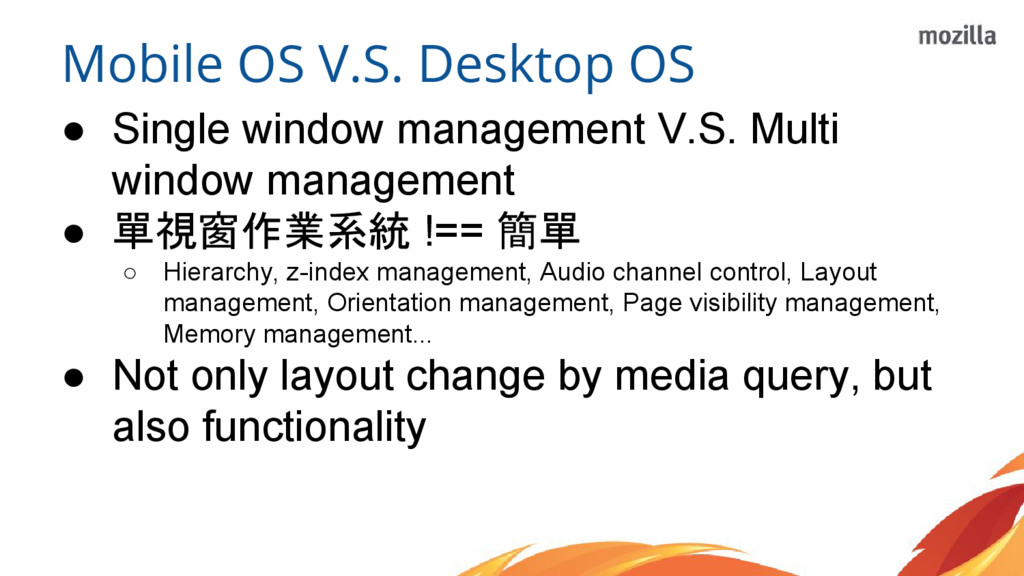 Multi window management • 單視窗作業系統 !== 簡單 ◦ Hierarchy, z-index management, Audio channel control, Layout management, Orientation management, Page visibility management, Memory management... • Not only layout change by media query, but also functionality