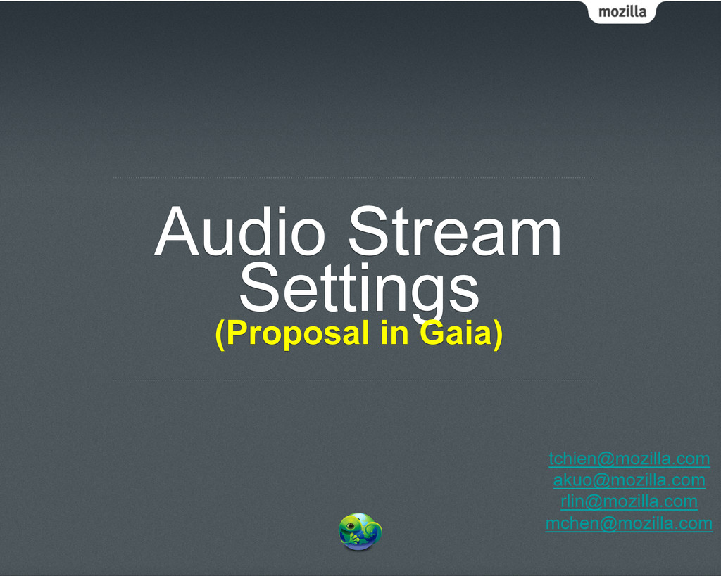 FM n Ring n Alarm n Bug 705237 is introducing a new attribute for audio tag/object. n Audio.mozAudioStreamType n These two concepts could be merged. Using the same set of strings in mainStreamType of mainfest and audio’s audioStreamType.