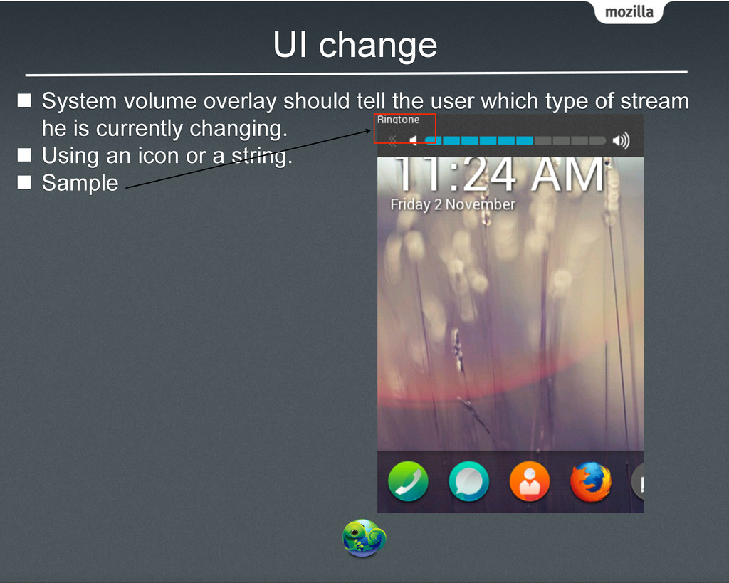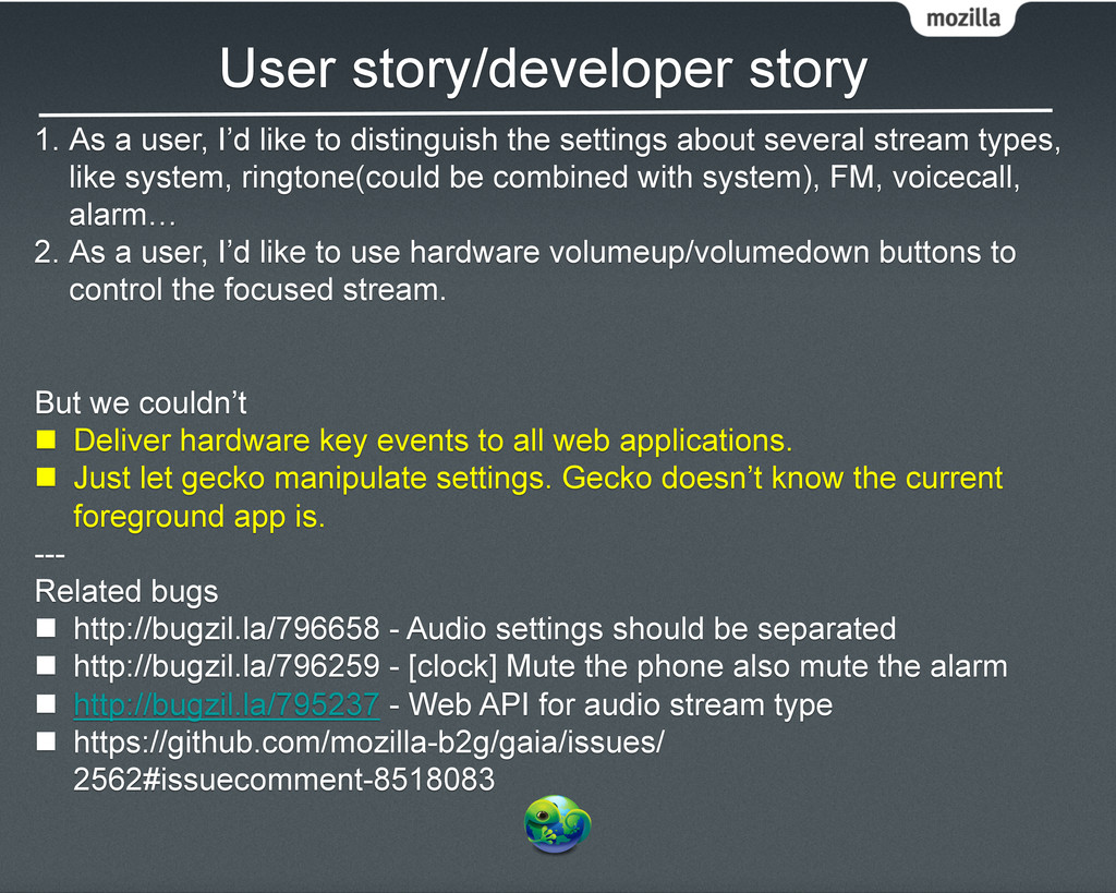 distinguish the settings about several stream types, like system, ringtone(could be combined with system), FM, voicecall, alarm… 2. As a user, I’d like to use hardware volumeup/volumedown buttons to control the focused stream. But we couldn’t n Deliver hardware key events to all web applications. n Just let gecko manipulate settings. Gecko doesn’t know the current foreground app is. --- Related bugs n http://bugzil.la/796658 - Audio settings should be separated n http://bugzil.la/796259 - [clock] Mute the phone also mute the alarm n http://bugzil.la/795237 - Web API for audio stream type n https://github.com/mozilla-b2g/gaia/issues/ 2562#issuecomment-8518083