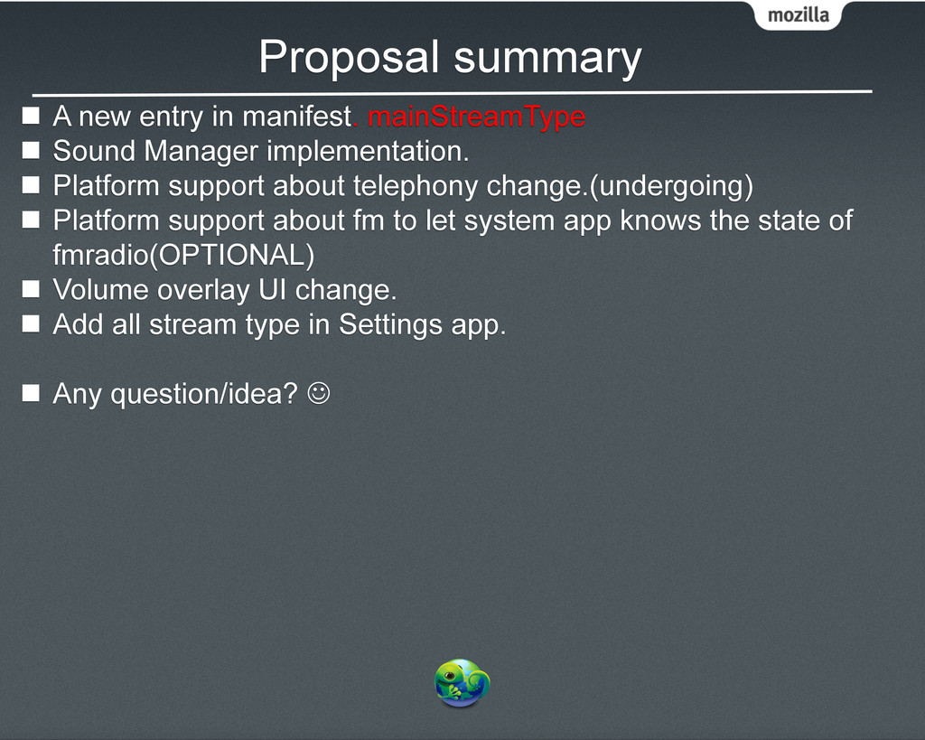 Sound Manager implementation. n Platform support about telephony change.(undergoing) n Platform support about fm to let system app knows the state of fmradio(OPTIONAL) n Volume overlay UI change. n Add all stream type in Settings app. n Any question/idea? J