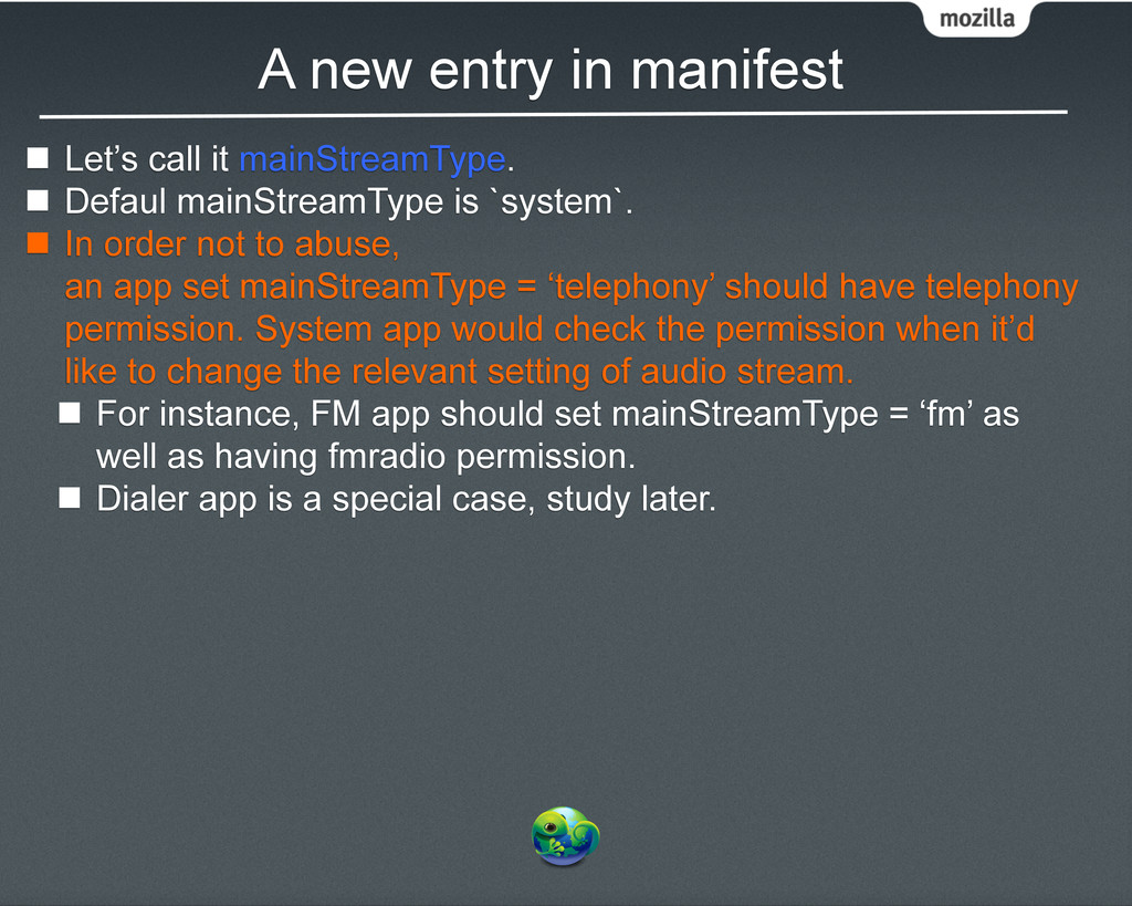 n Defaul mainStreamType is `system`. n In order not to abuse, an app set mainStreamType = ‘telephony’ should have telephony permission. System app would check the permission when it’d like to change the relevant setting of audio stream. n For instance, FM app should set mainStreamType = ‘fm’ as well as having fmradio permission. n Dialer app is a special case, study later.
