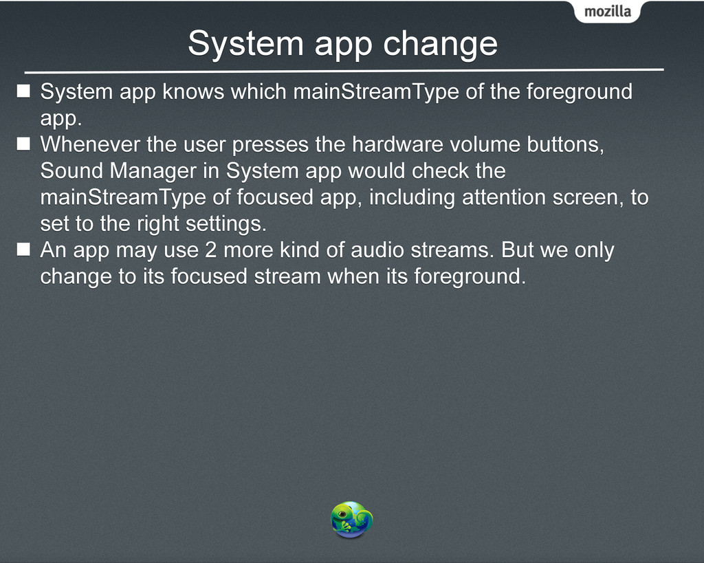 the foreground app. n Whenever the user presses the hardware volume buttons, Sound Manager in System app would check the mainStreamType of focused app, including attention screen, to set to the right settings. n An app may use 2 more kind of audio streams. But we only change to its focused stream when its foreground.