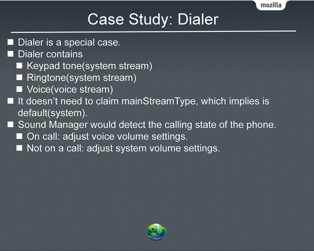 Dialer contains n Keypad tone(system stream) n Ringtone(system stream) n Voice(voice stream) n It doesn’t need to claim mainStreamType, which implies is default(system). n Sound Manager would detect the calling state of the phone. n On call: adjust voice volume settings. n Not on a call: adjust system volume settings.