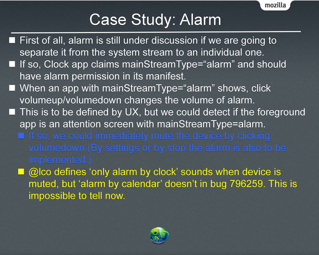 under discussion if we are going to separate it from the system stream to an individual one. n If so, Clock app claims mainStreamType=“alarm” and should have alarm permission in its manifest. n When an app with mainStreamType=“alarm” shows, click volumeup/volumedown changes the volume of alarm. n This is to be defined by UX, but we could detect if the foreground app is an attention screen with mainStreamType=alarm. n If so, we could immediately mute the device by clicking volumedown.(By settings or by stop the alarm is also to be implemented.) n @lco defines ‘only alarm by clock’ sounds when device is muted, but ‘alarm by calendar’ doesn’t in bug 796259. This is impossible to tell now.