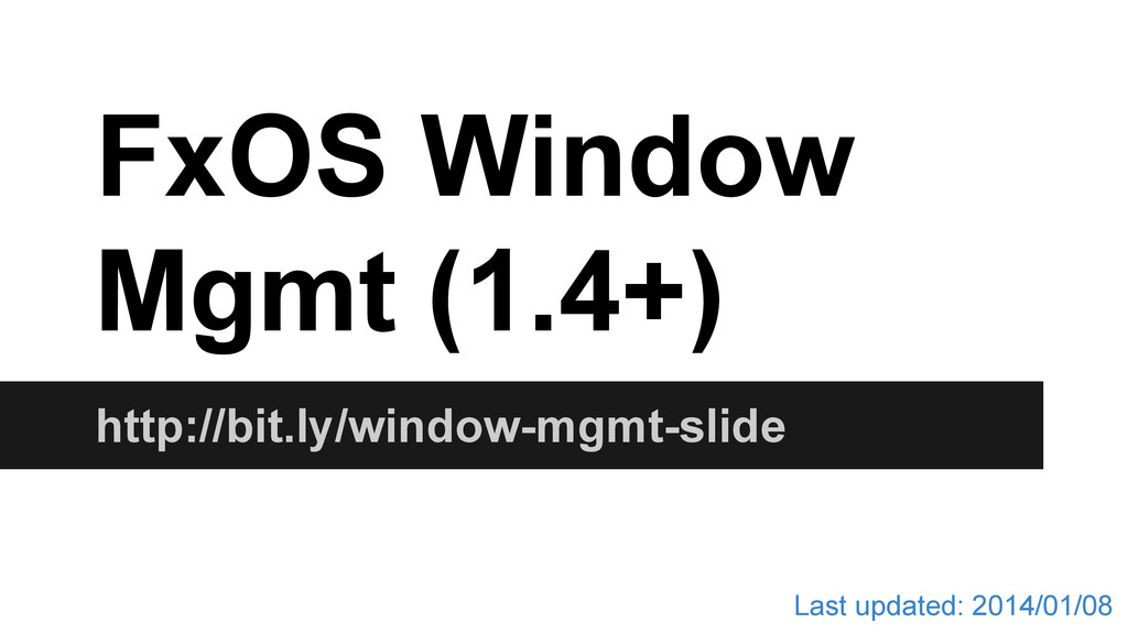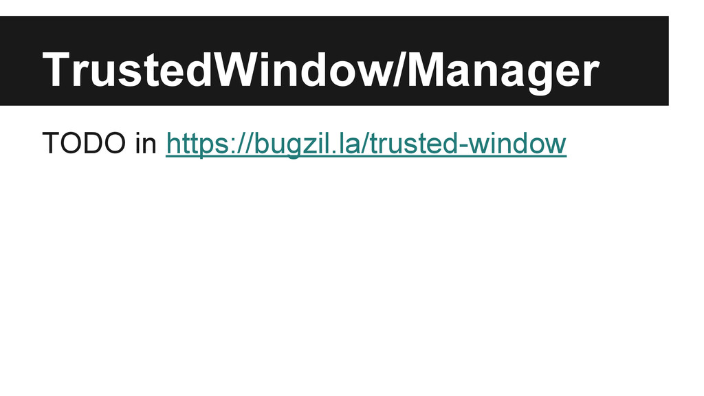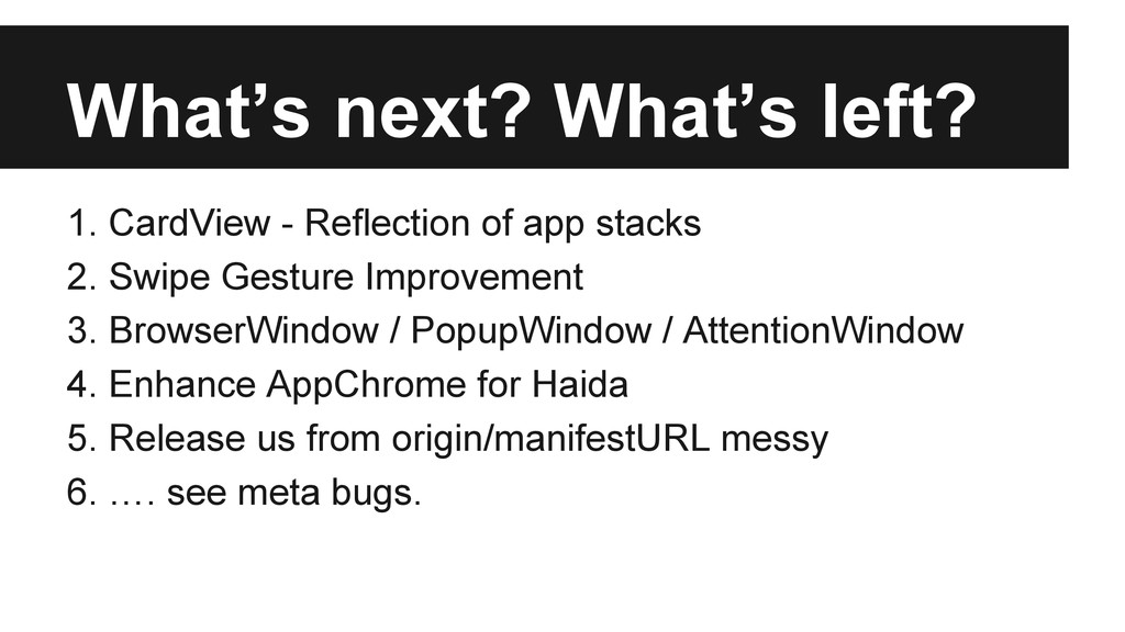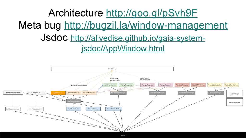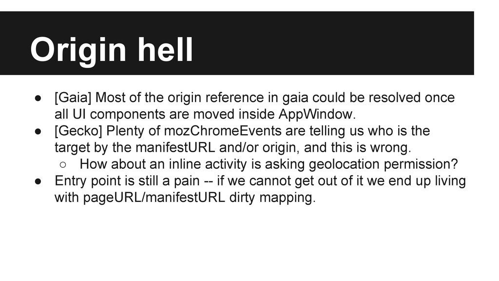 gaia could be resolved once all UI components are moved inside AppWindow. • [Gecko] Plenty of mozChromeEvents are telling us who is the target by the manifestURL and/or origin, and this is wrong. ◦ How about an inline activity is asking geolocation permission? • Entry point is still a pain -- if we cannot get out of it we end up living with pageURL/manifestURL dirty mapping.