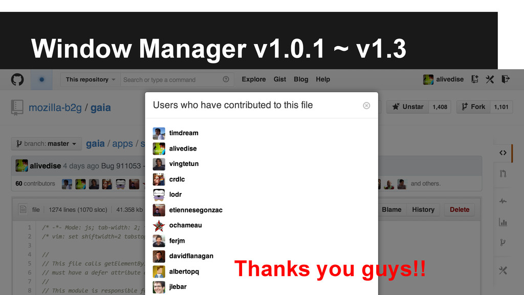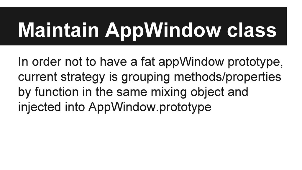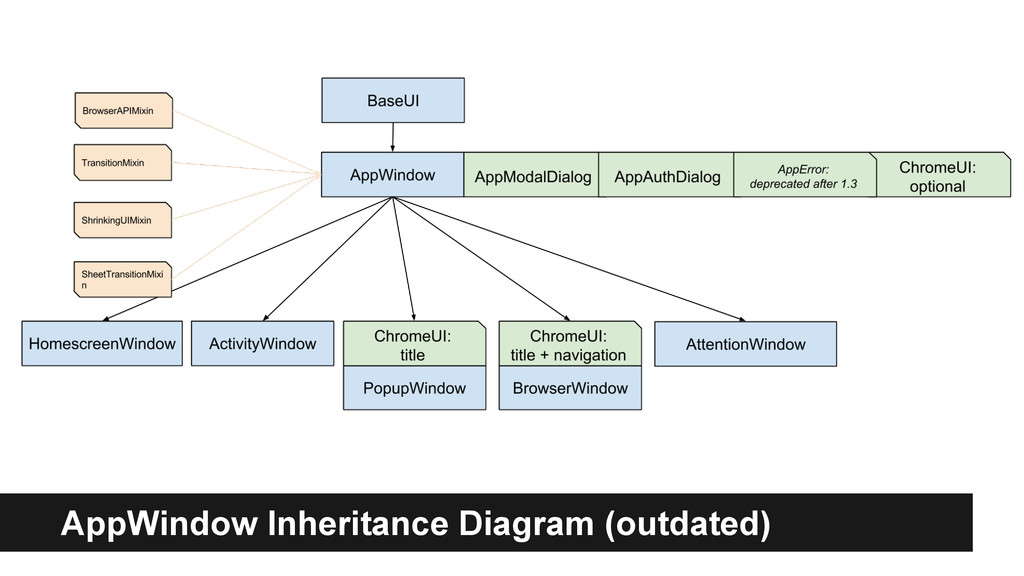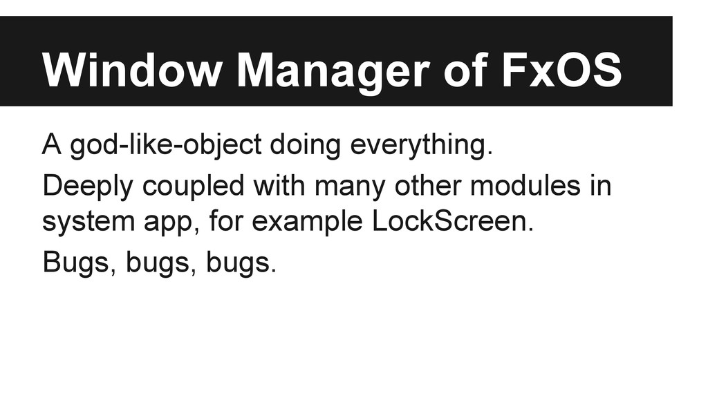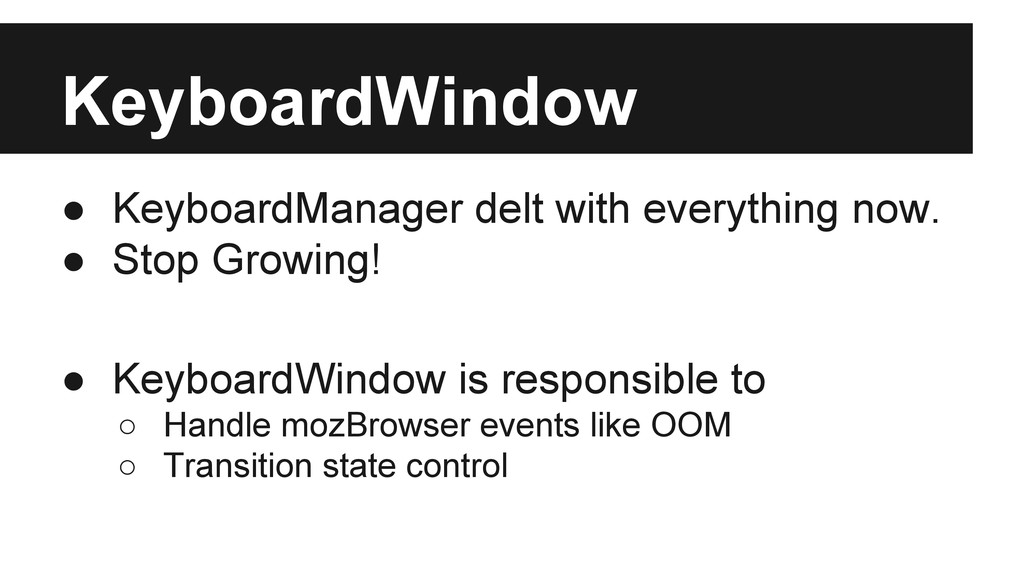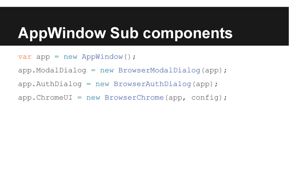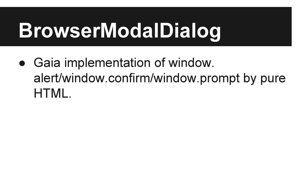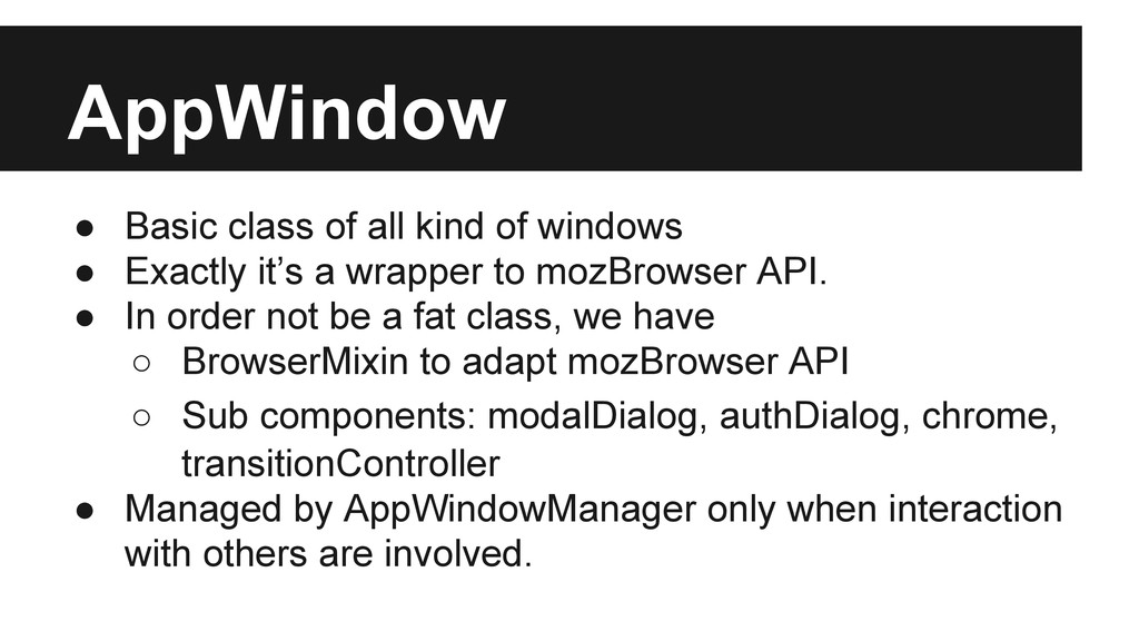 Exactly it’s a wrapper to mozBrowser API. • In order not be a fat class, we have ◦ BrowserMixin to adapt mozBrowser API ◦ Sub components: modalDialog, authDialog, chrome, transitionController • Managed by AppWindowManager only when interaction with others are involved.
