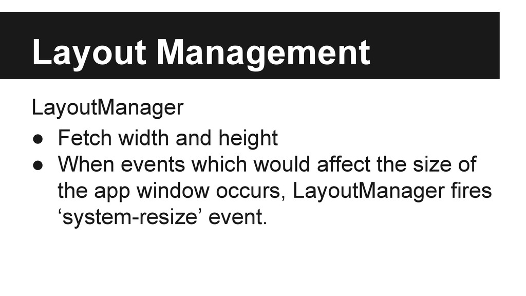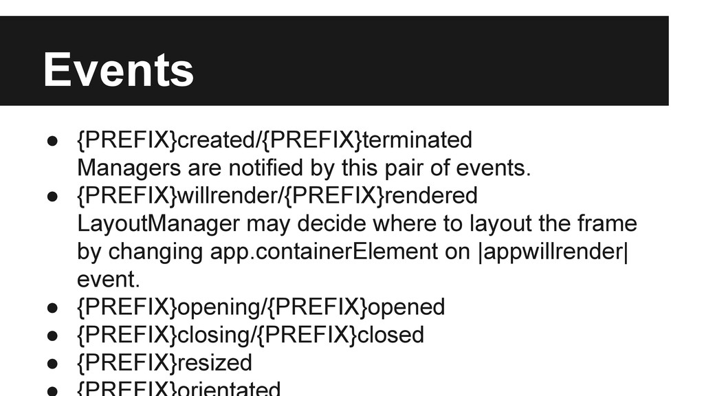 events. • {PREFIX}willrender/{PREFIX}rendered LayoutManager may decide where to layout the frame by changing app.containerElement on |appwillrender| event. • {PREFIX}opening/{PREFIX}opened • {PREFIX}closing/{PREFIX}closed • {PREFIX}resized