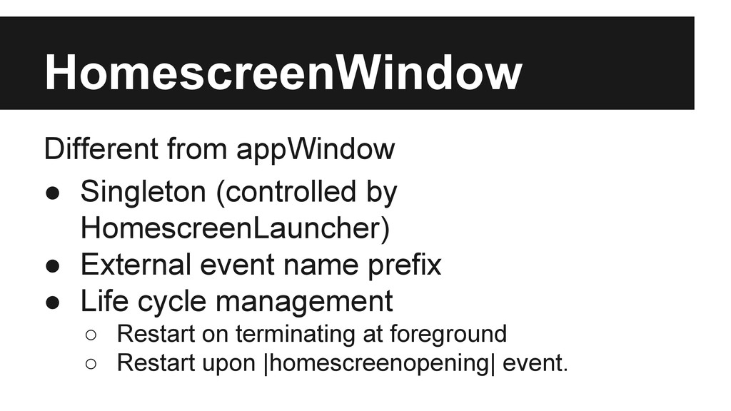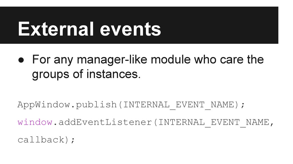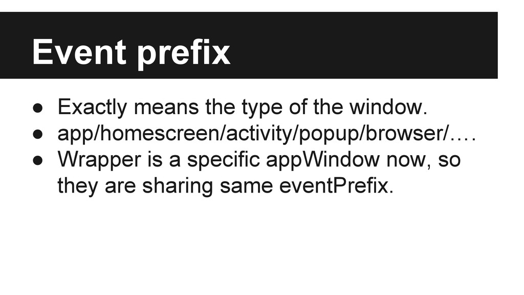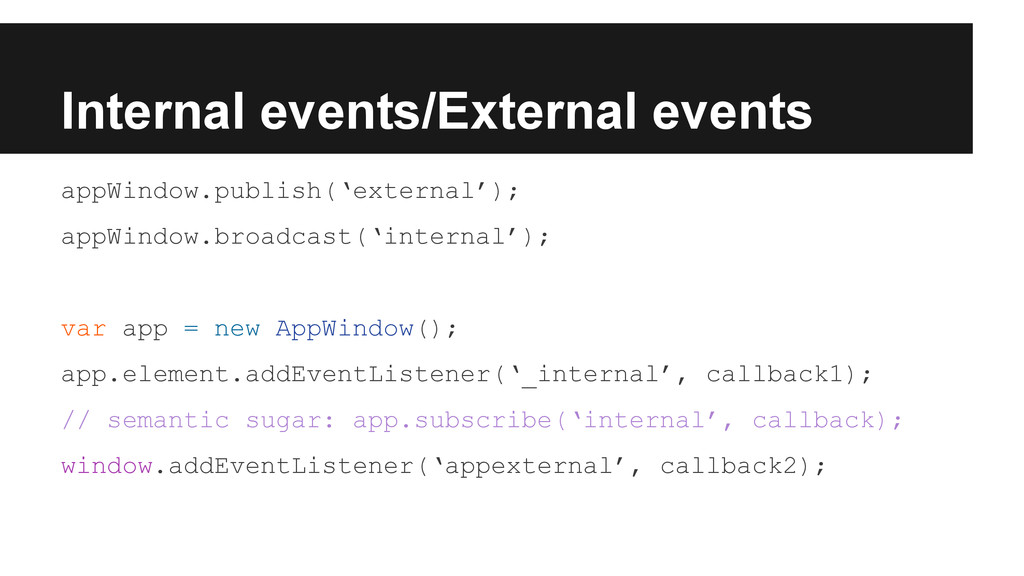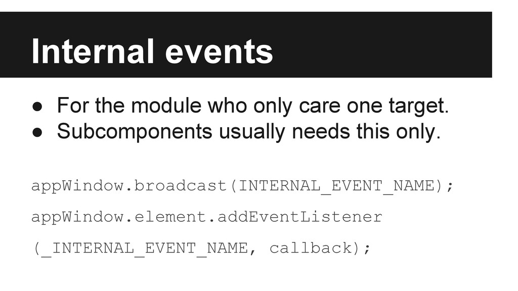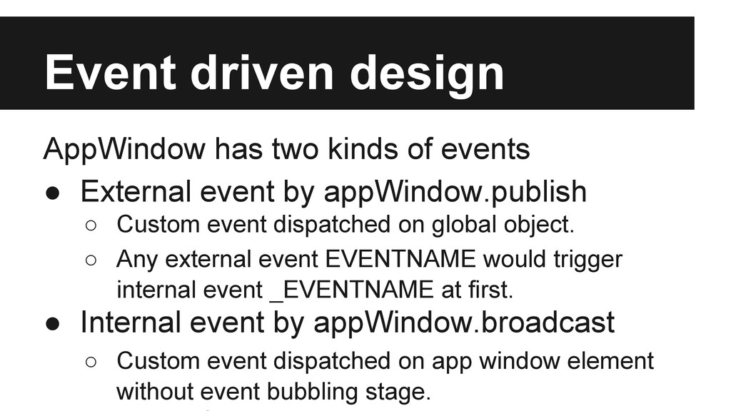 External event by appWindow.publish ◦ Custom event dispatched on global object. ◦ Any external event EVENTNAME would trigger internal event _EVENTNAME at first. • Internal event by appWindow.broadcast ◦ Custom event dispatched on app window element without event bubbling stage.