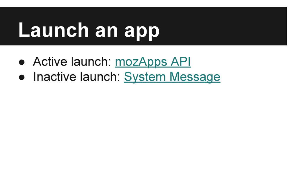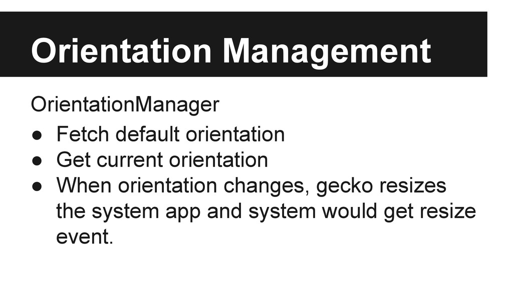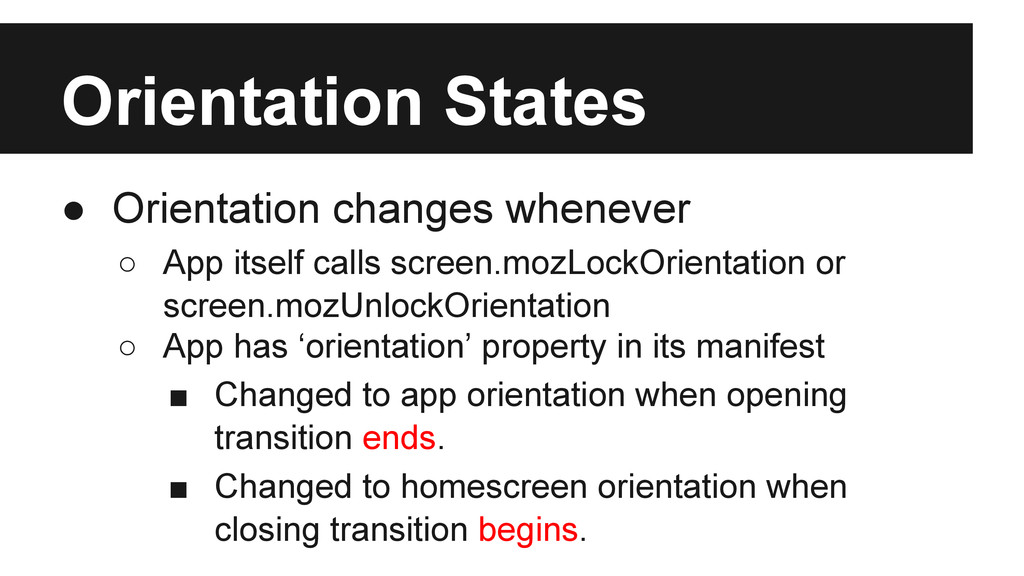 screen.mozLockOrientation or screen.mozUnlockOrientation ◦ App has ‘orientation’ property in its manifest ▪ Changed to app orientation when opening transition ends. ▪ Changed to homescreen orientation when closing transition begins.