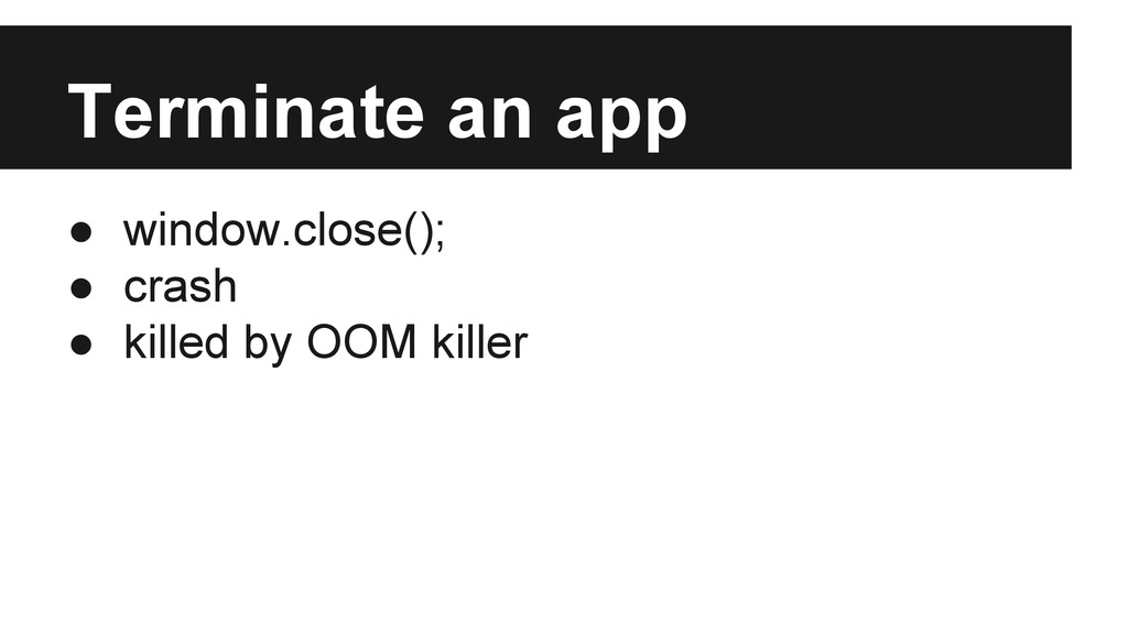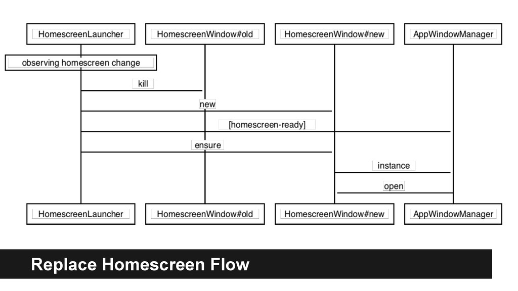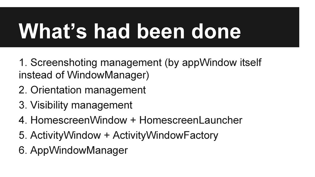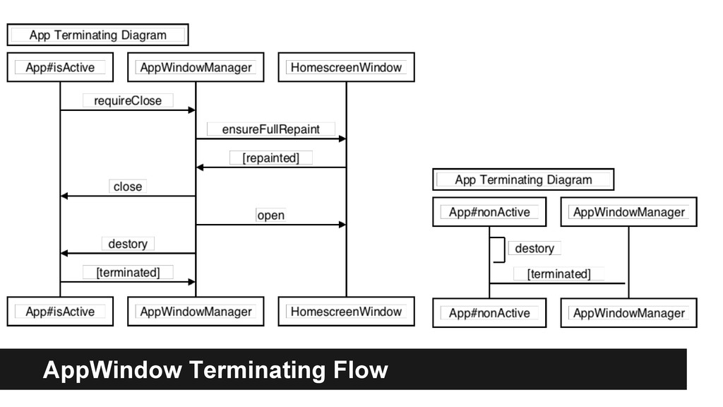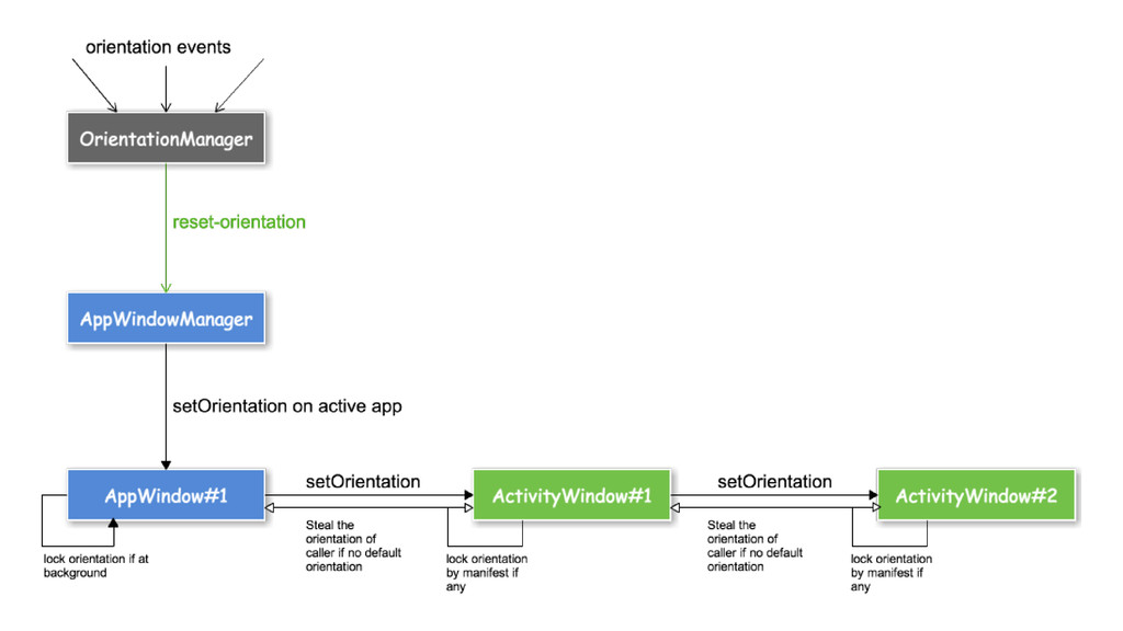 from caller when no fullscreen/orientation propery in its manifest. • Life cycle management ◦ When killed: kill callee until the end of the chain. ◦ reopen caller if killed at foreground by caller. requestOpen() and AppWindowManager would
