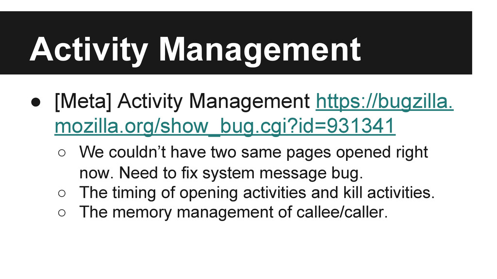 couldn’t have two same pages opened right now. Need to fix system message bug. ◦ The timing of opening activities and kill activities. ◦ The memory management of callee/caller.