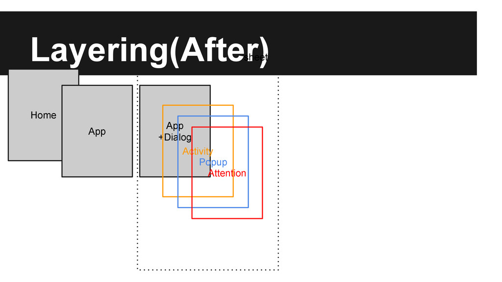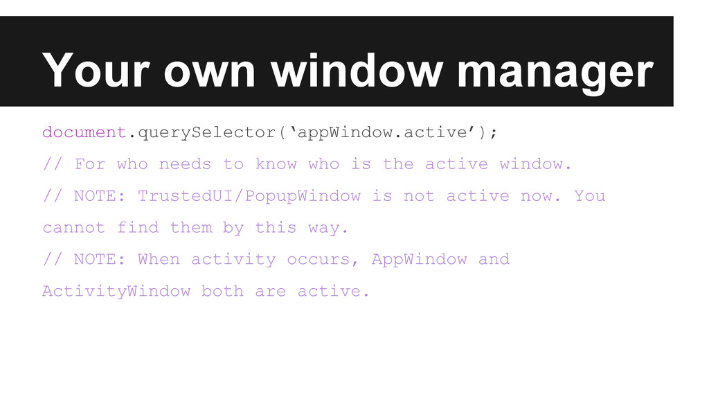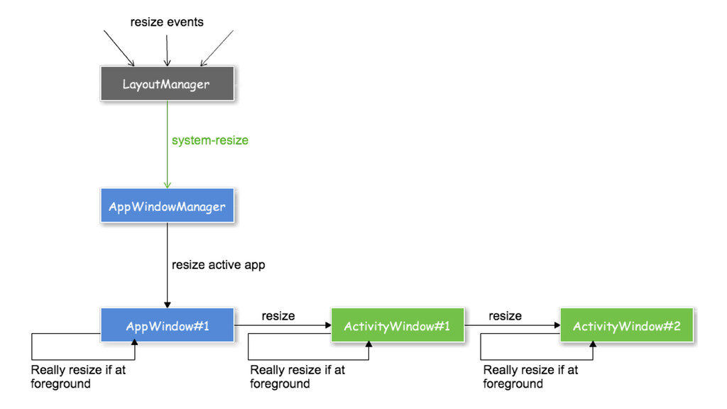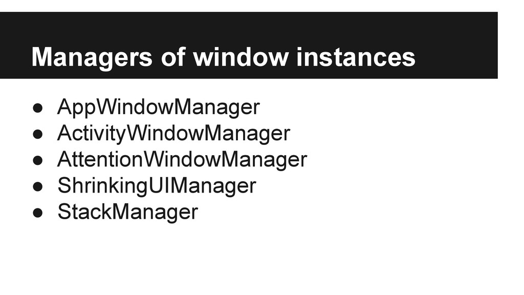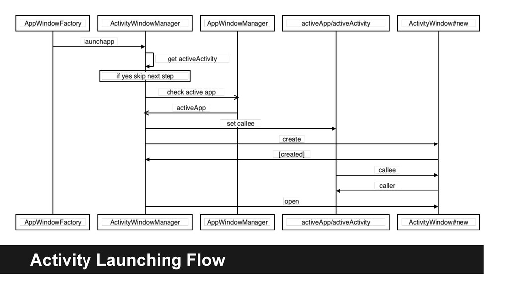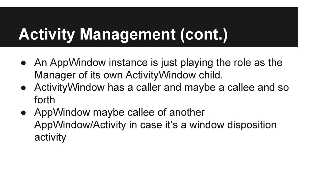 the role as the Manager of its own ActivityWindow child. • ActivityWindow has a caller and maybe a callee and so forth • AppWindow maybe callee of another AppWindow/Activity in case it’s a window disposition activity