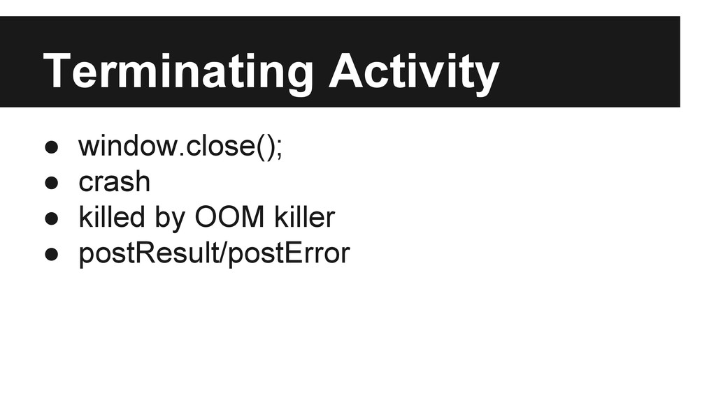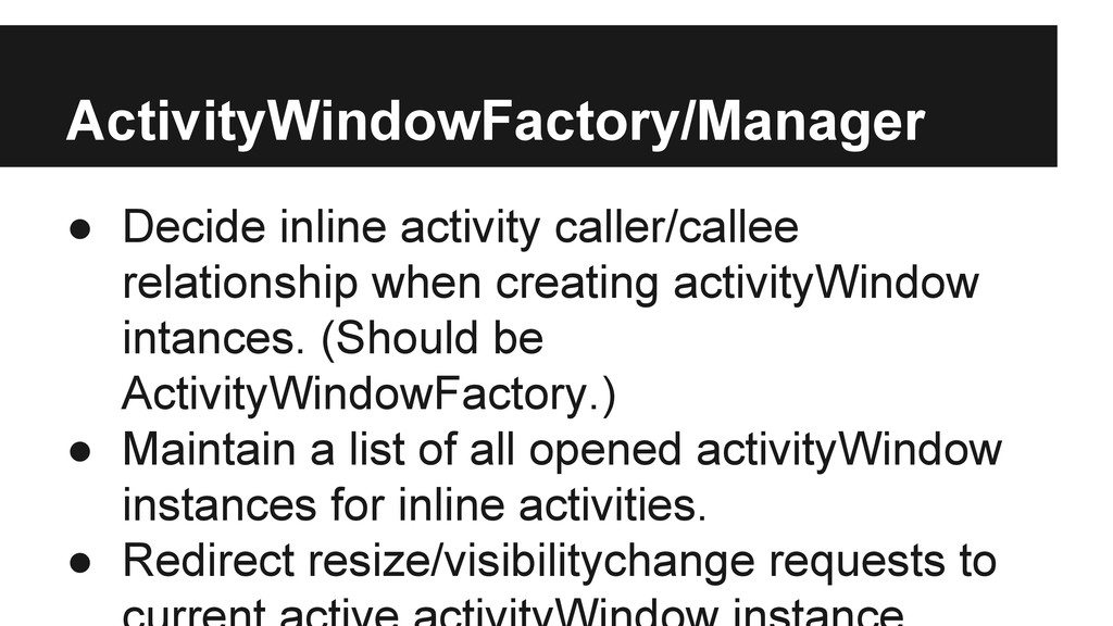 intances. (Should be ActivityWindowFactory.) • Maintain a list of all opened activityWindow instances for inline activities. • Redirect resize/visibilitychange requests to
