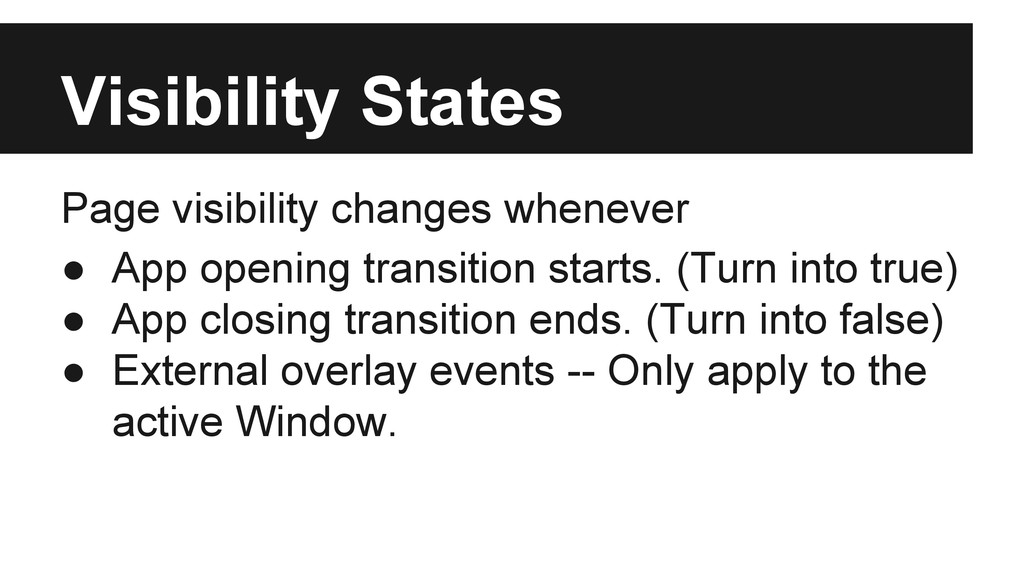 a list of instances you are intereseted in. • Know the transition state change by appopened/appclosed events. • Know the visibility state change by appforeground/appbackground events