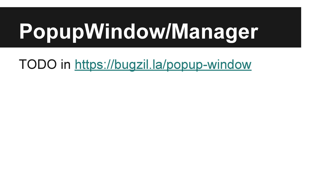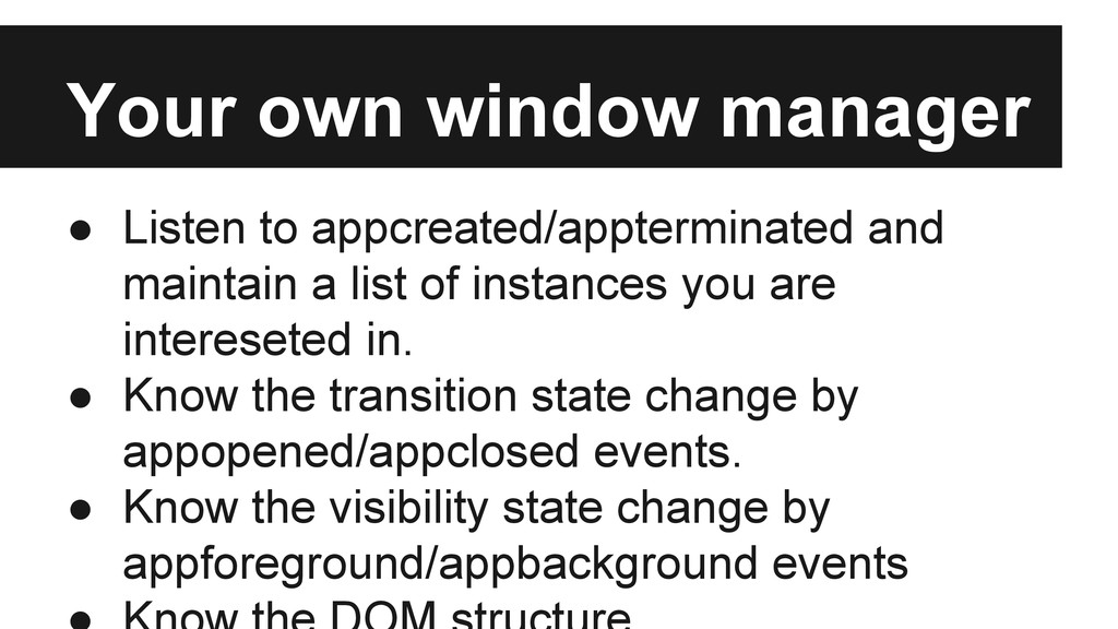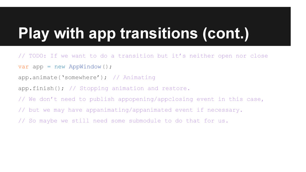 to do a transition but it’s neither open nor close var app = new AppWindow(); app.animate(‘somewhere’); // Animating app.finish(); // Stopping animation and restore. // We don’t need to publish appopening/appclosing event in this case, // but we may have appanimating/appanimated event if necessary. // So maybe we still need some submodule to do that for us.