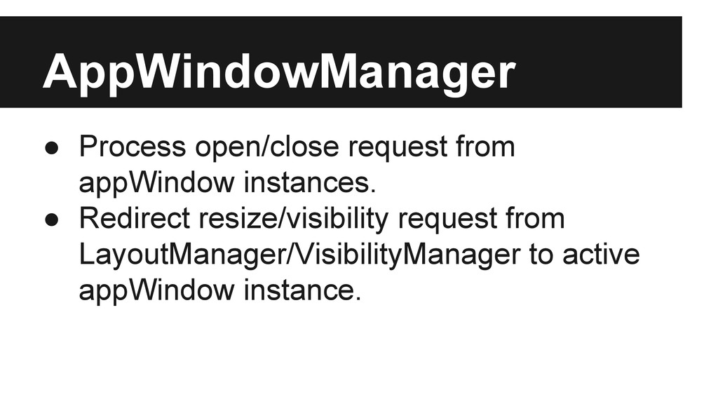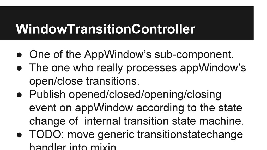 who really processes appWindow’s open/close transitions. • Publish opened/closed/opening/closing event on appWindow according to the state change of internal transition state machine. • TODO: move generic transitionstatechange