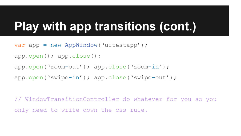 app.open(); app.close(): app.open(‘zoom-out’); app.close(‘zoom-in’); app.open(‘swipe-in’); app.close(‘swipe-out’); // WindowTransitionController do whatever for you so you only need to write down the css rule.