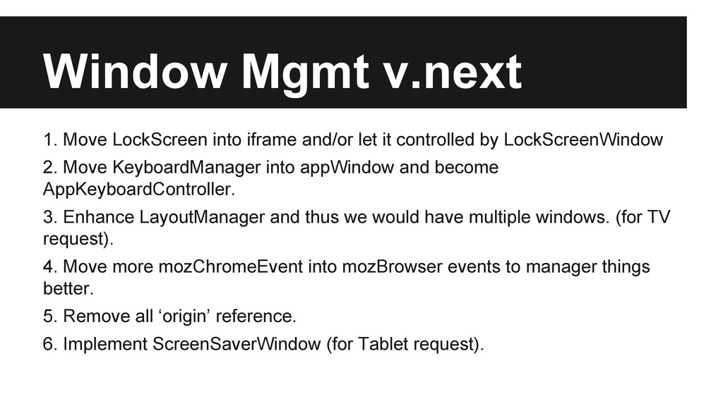 it controlled by LockScreenWindow 2. Move KeyboardManager into appWindow and become AppKeyboardController. 3. Enhance LayoutManager and thus we would have multiple windows. (for TV request). 4. Move more mozChromeEvent into mozBrowser events to manager things better. 5. Remove all ‘origin’ reference. 6. Implement ScreenSaverWindow (for Tablet request).