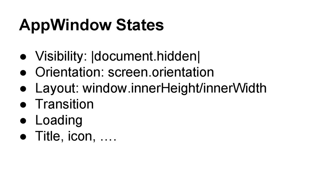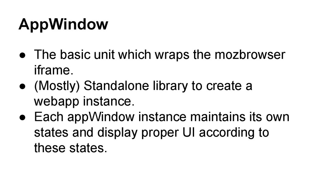 • (Mostly) Standalone library to create a webapp instance. • Each appWindow instance maintains its own states and display proper UI according to these states.