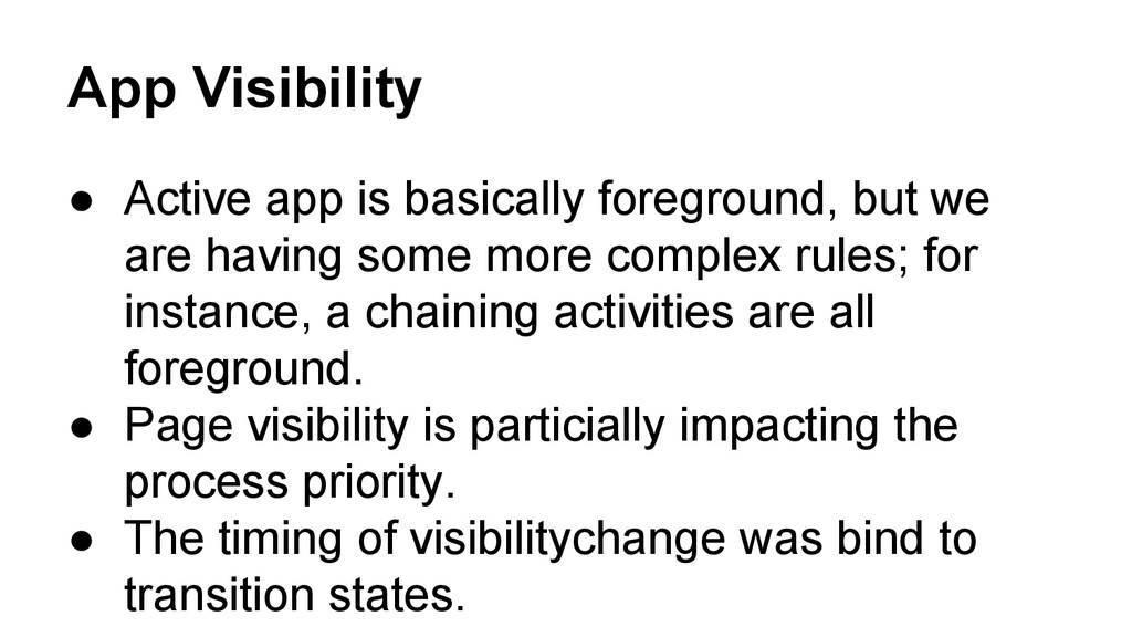 are having some more complex rules; for instance, a chaining activities are all foreground. • Page visibility is particially impacting the process priority. • The timing of visibilitychange was bind to transition states.