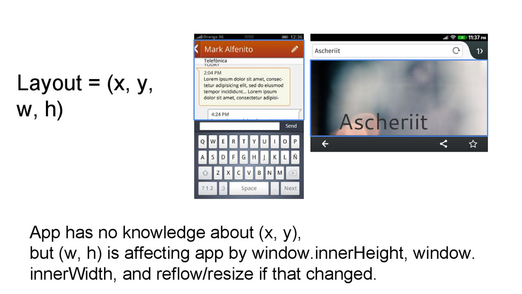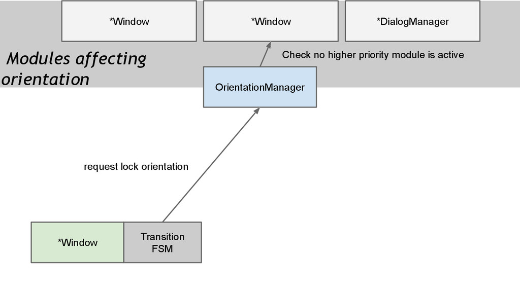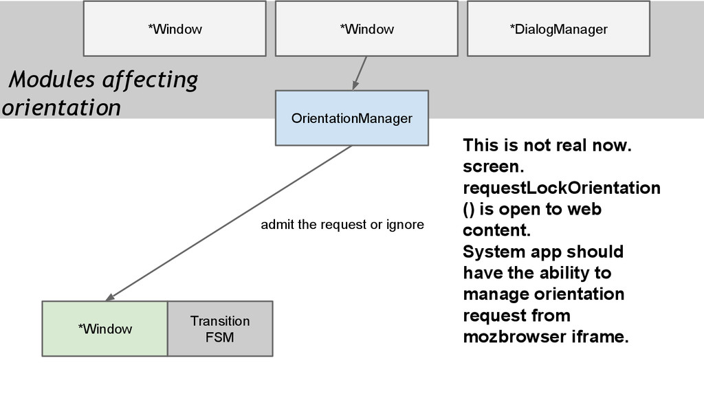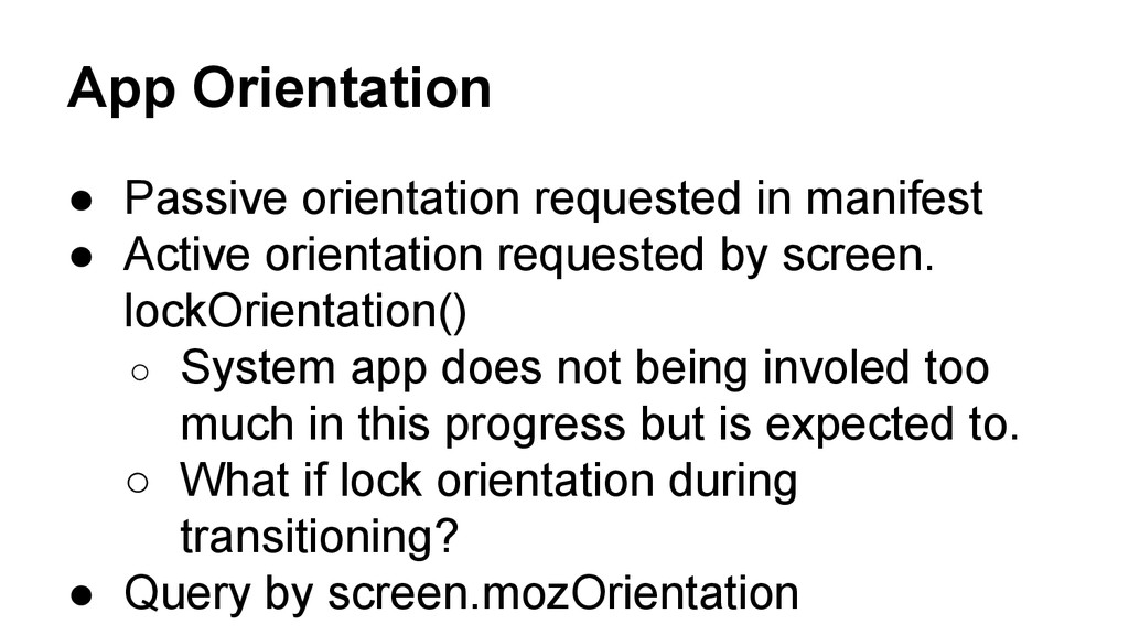orientation requested by screen. lockOrientation() ◦ System app does not being involed too much in this progress but is expected to. ◦ What if lock orientation during transitioning? • Query by screen.mozOrientation