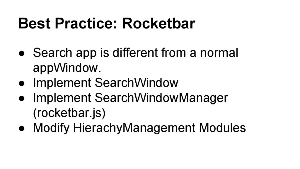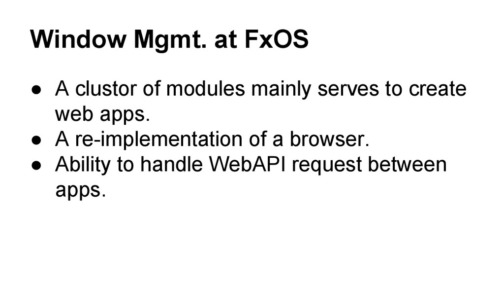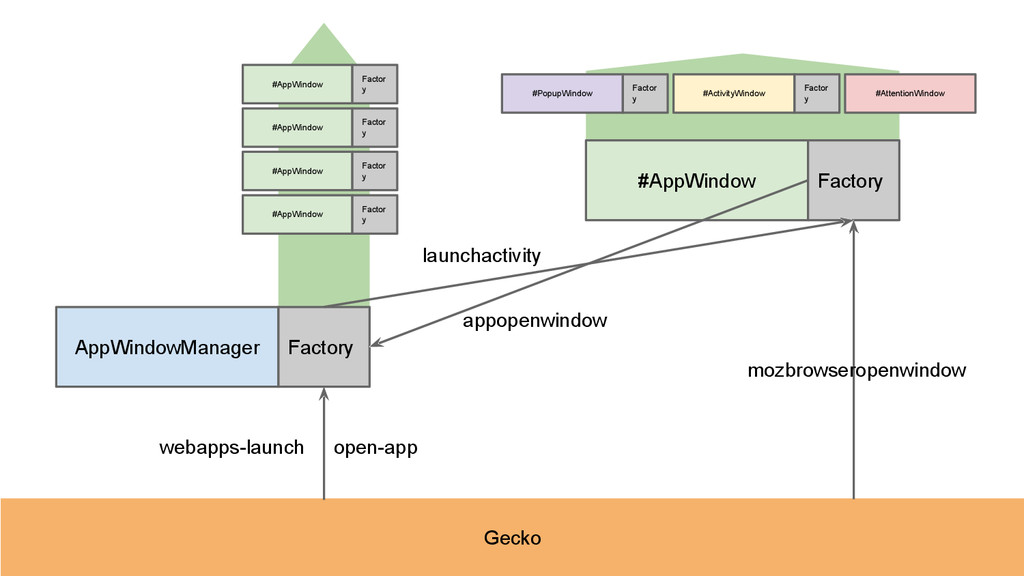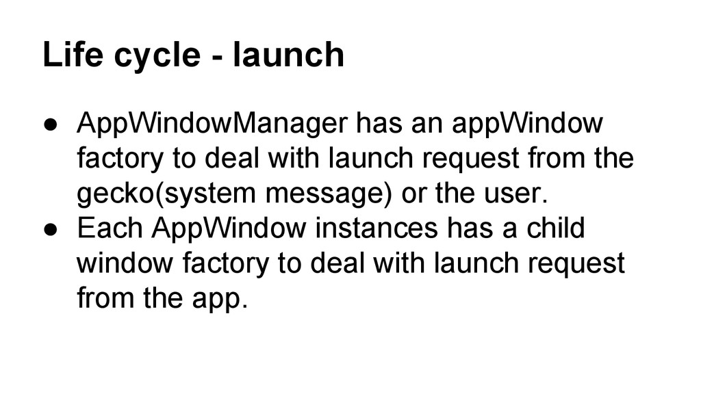 to deal with launch request from the gecko(system message) or the user. • Each AppWindow instances has a child window factory to deal with launch request from the app.