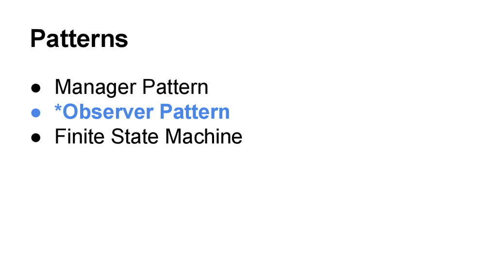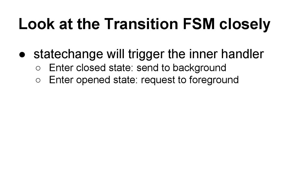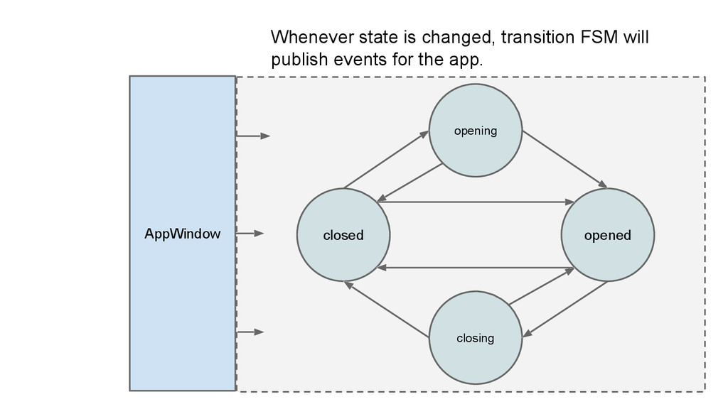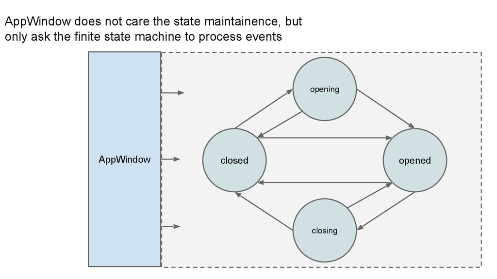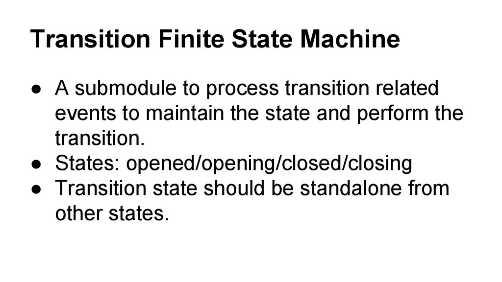 related events to maintain the state and perform the transition. • States: opened/opening/closed/closing • Transition state should be standalone from other states.