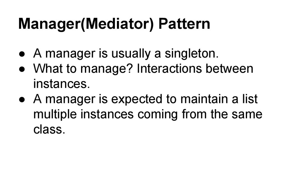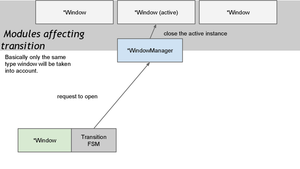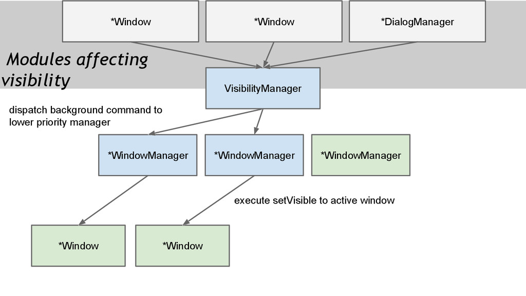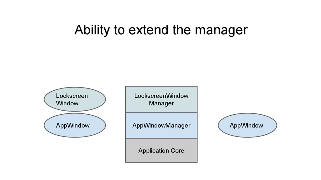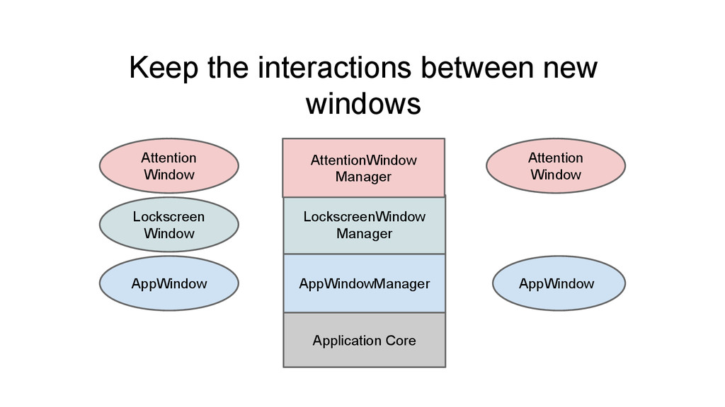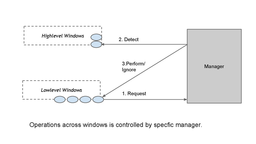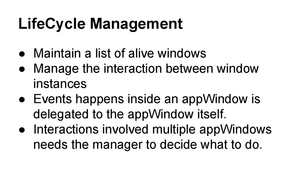 Manage the interaction between window instances • Events happens inside an appWindow is delegated to the appWindow itself. • Interactions involved multiple appWindows needs the manager to decide what to do.