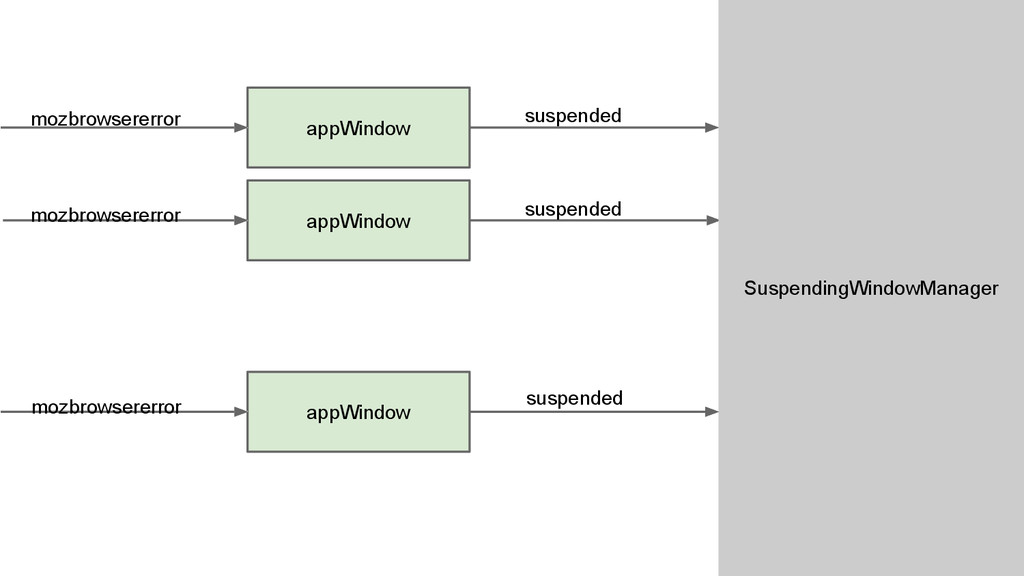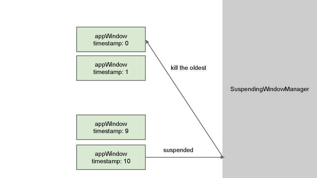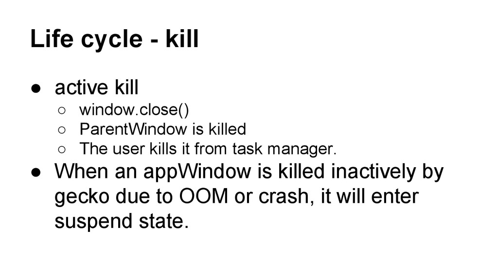 ParentWindow is killed ◦ The user kills it from task manager. • When an appWindow is killed inactively by gecko due to OOM or crash, it will enter suspend state.