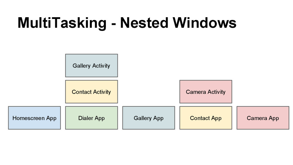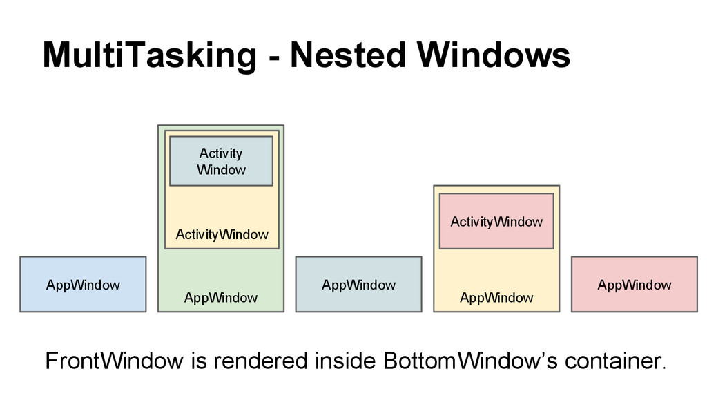 ActivityWindow#A • ActivityWindow#A manages ActivityWindow#B • Only parentWindow/childWindow refers each other; the grandparentWindow(AppWindow#1) does not need to know the state of the grandchildWindow(ActivityWindow#B) • However, kill a parentWindow will kill the childWindow which causes a chaining kill.