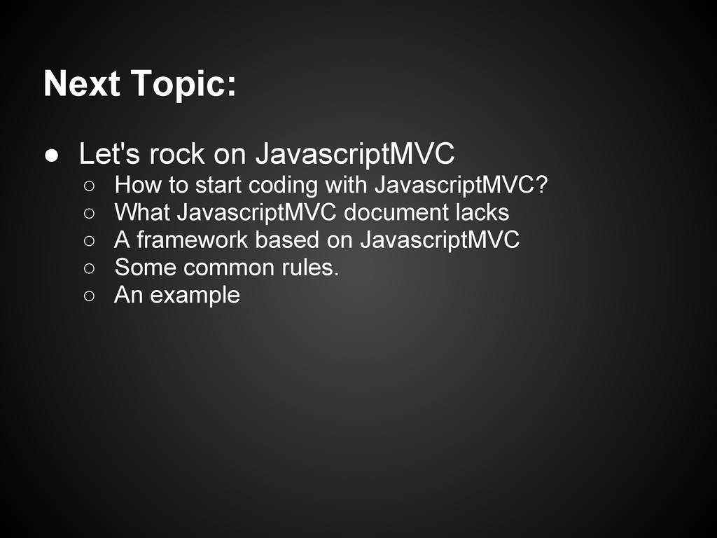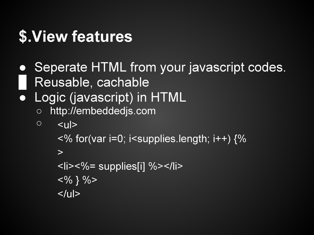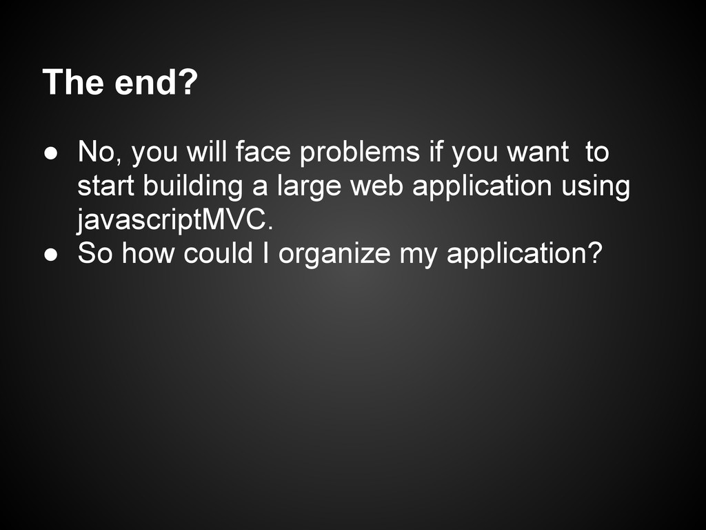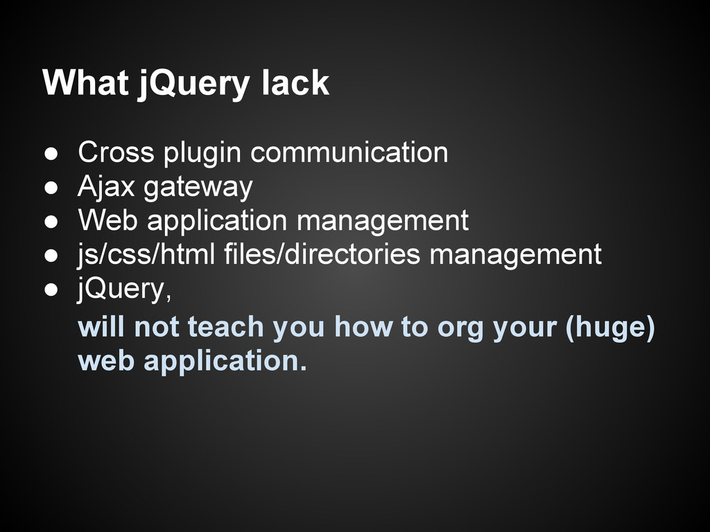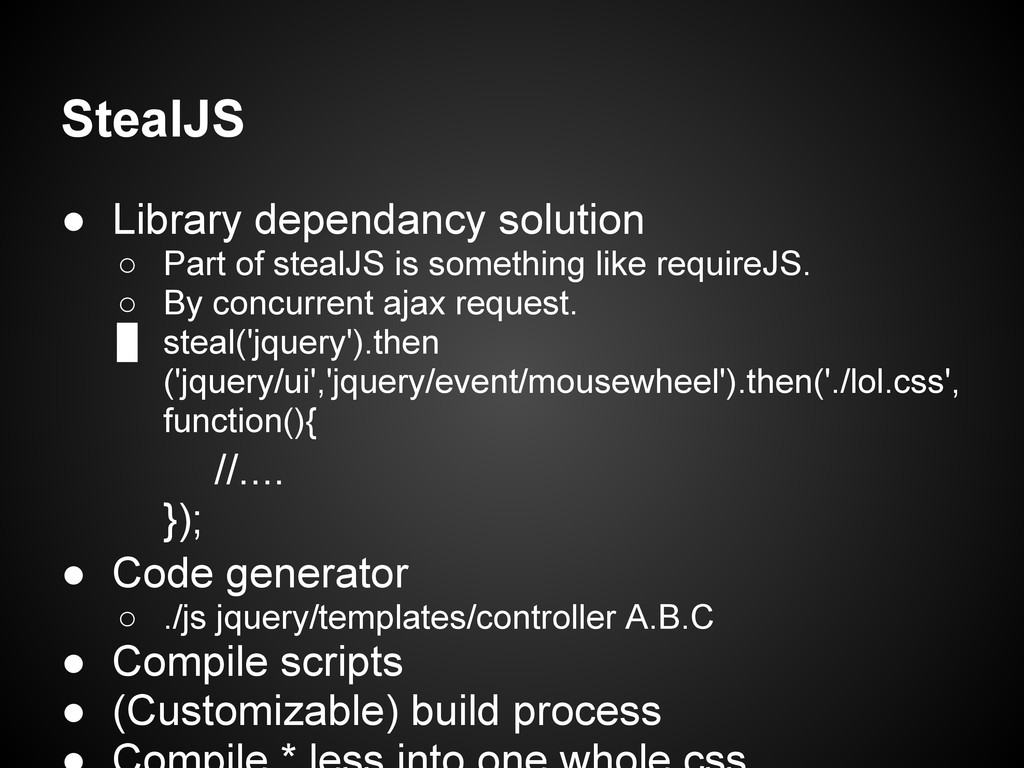 something like requireJS. ◦ By concurrent ajax request. ◦ steal('jquery').then ('jquery/ui','jquery/event/mousewheel').then('./lol.css', function(){ //.... }); • Code generator ◦ ./js jquery/templates/controller A.B.C • Compile scripts • (Customizable) build process