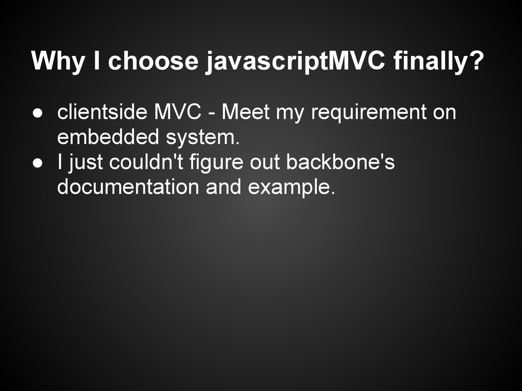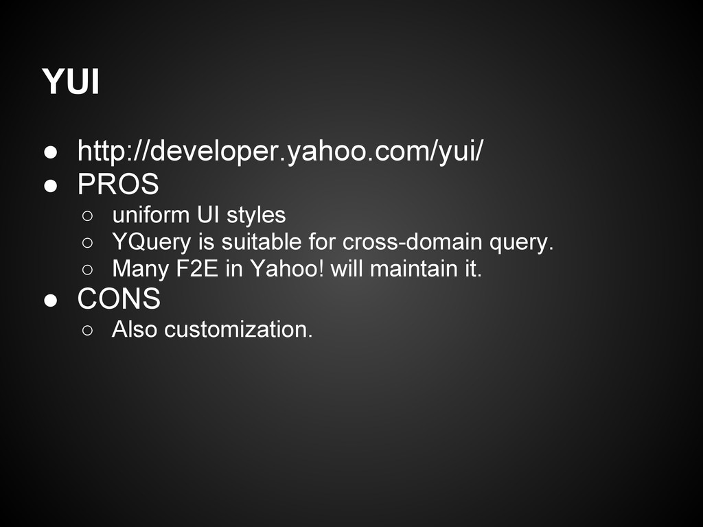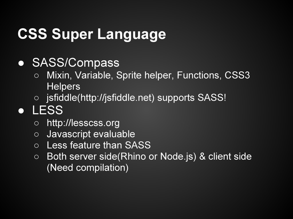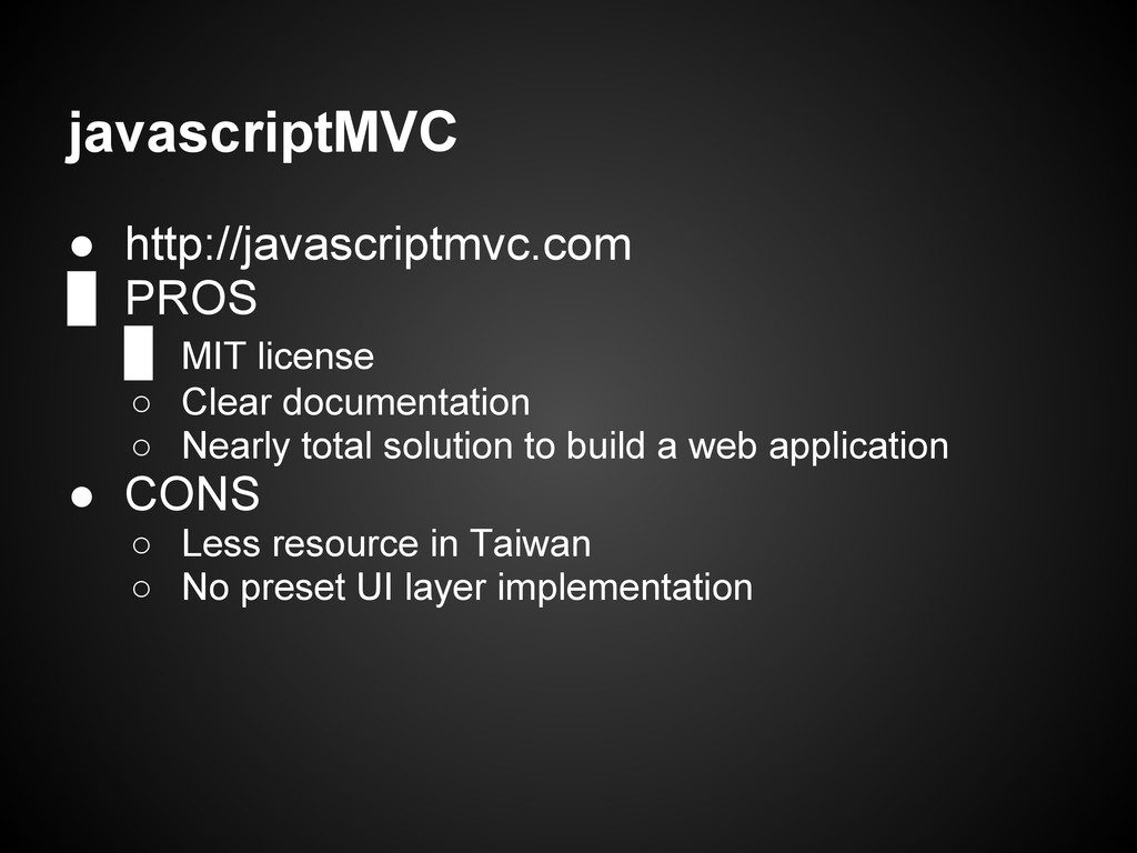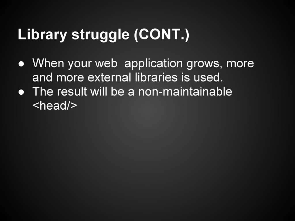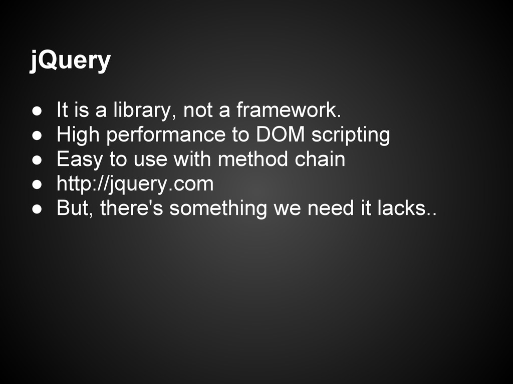 something like requireJS. ◦ By concurrent ajax request. ◦ steal('jquery').then ('jquery/ui','jquery/event/mousewheel').then('./lol.css', function(){ //.... }); • Code generator ◦ ./js jquery/templates/controller A.B.C • Compile scripts • (Customizable) build process